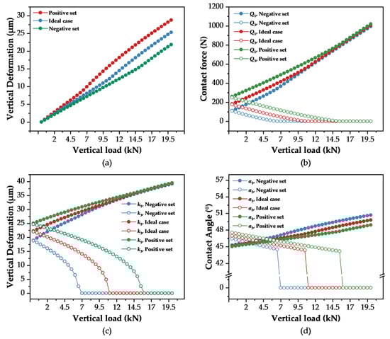 Influence of Typical Error Combinations on Contact Characteristics: (a) Vertical Deformation; (b) Contact Load; (c) Contact Stiffness; (d) Contact Angle.