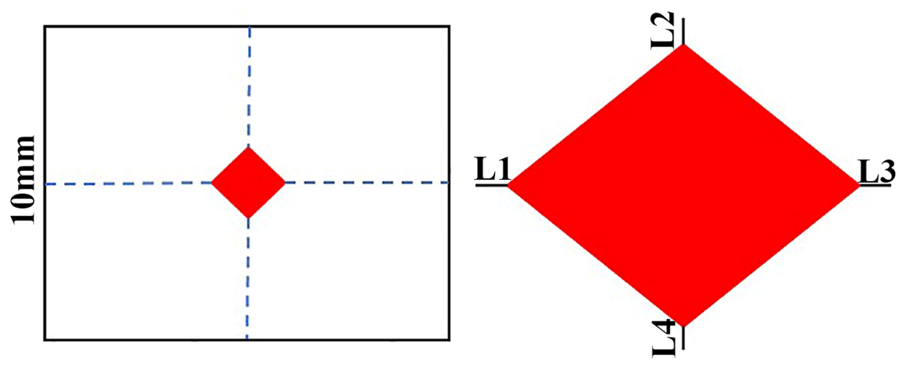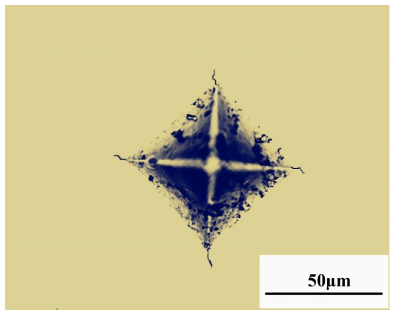 As shown in Figure 1, Vickers (HV30, Laizhou Yutong Test Instrument Co., Ltd., Laizhou, China) was used to make a rhombus indentation in the middle of the cross-section of the cladding layer. The cracks extended to the outside from the four corners of the rhombus were measured as L1, L2, L3, and L4. The fracture toughness of the cladding layer was calculated using Formulas (1) and (2) [30,31].