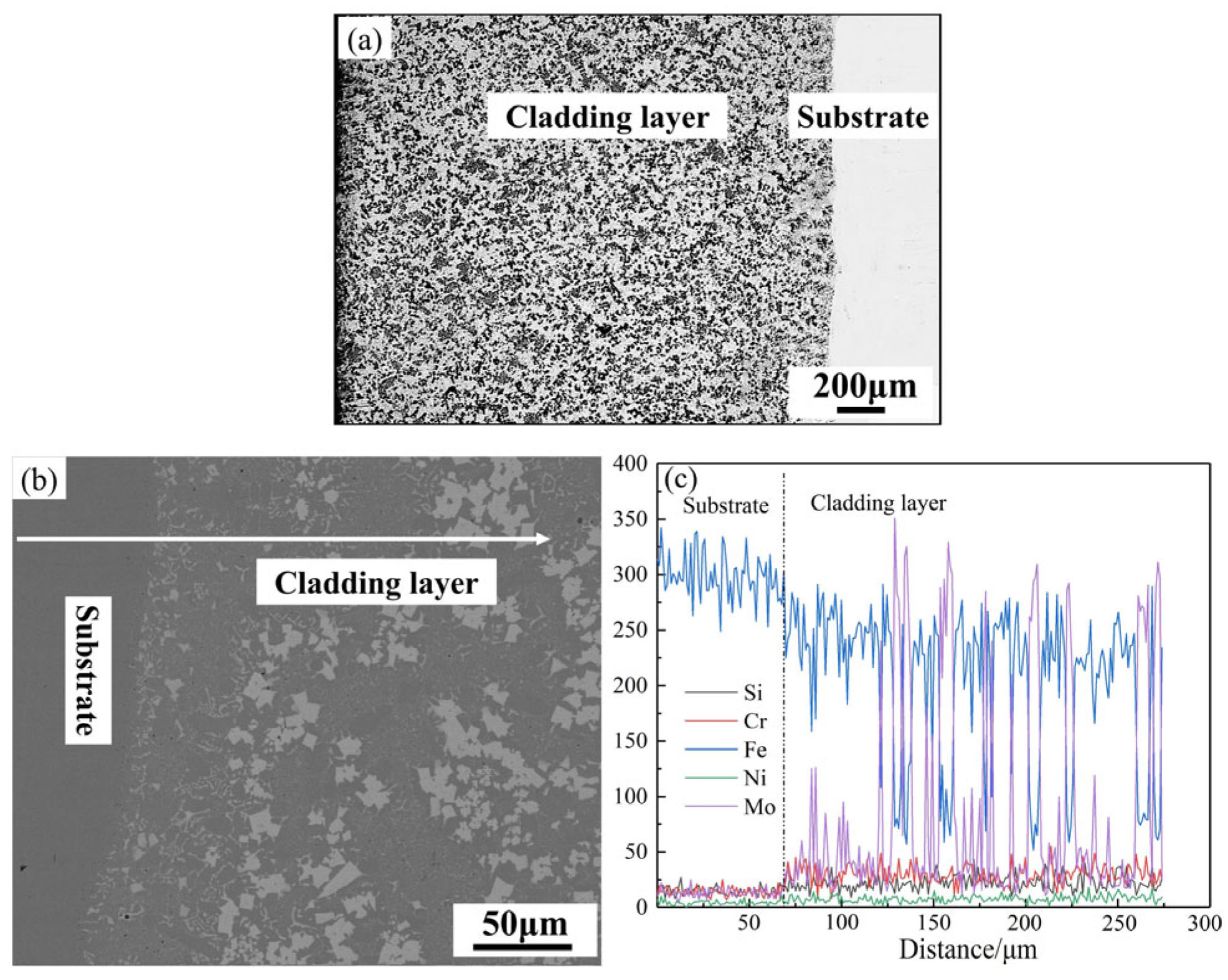 The OM cross-sectional morphology of the cladding layer is shown in Figure 2a, which indicates excellent bonding between the cladding layer and substrate, with no obvious pores or cracks at the interface. Figure 2b shows the SEM of the bonding zone, where the hard phase particles are evenly distributed in the cladding layer. The element distribution results marked in Figure 2b are shown in Figure 2c. The results indicate that different elements show variation at different positions, confirming the formation of a good metallurgical bond between the cladding layer and substrate.