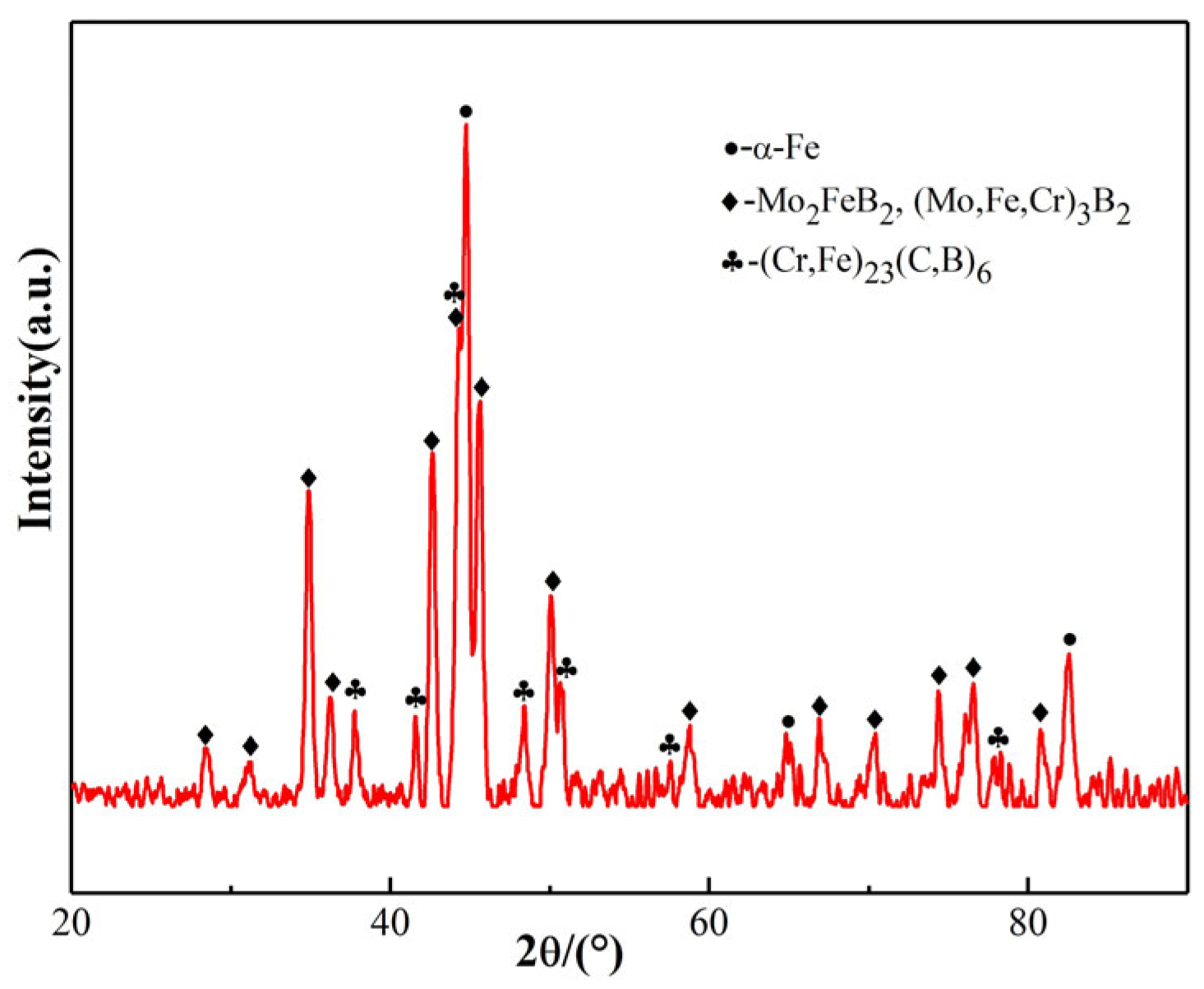 The XRD patterns of the boride coating on the surface of the Gr15 steel are shown in Figure 3. It was noticed that the coating was mainly composed of the hard phase Mo2FeB2, and M23(C,B)6, while the binder phase was α-Fe. Due to the dilution effect of GCr15 steel, the C element content in the cladding layer was increased. In addition, higher concentrations of Fe, Cr, and B elements in the cladding layer resulted in the precipitation of M23(C,B)6.