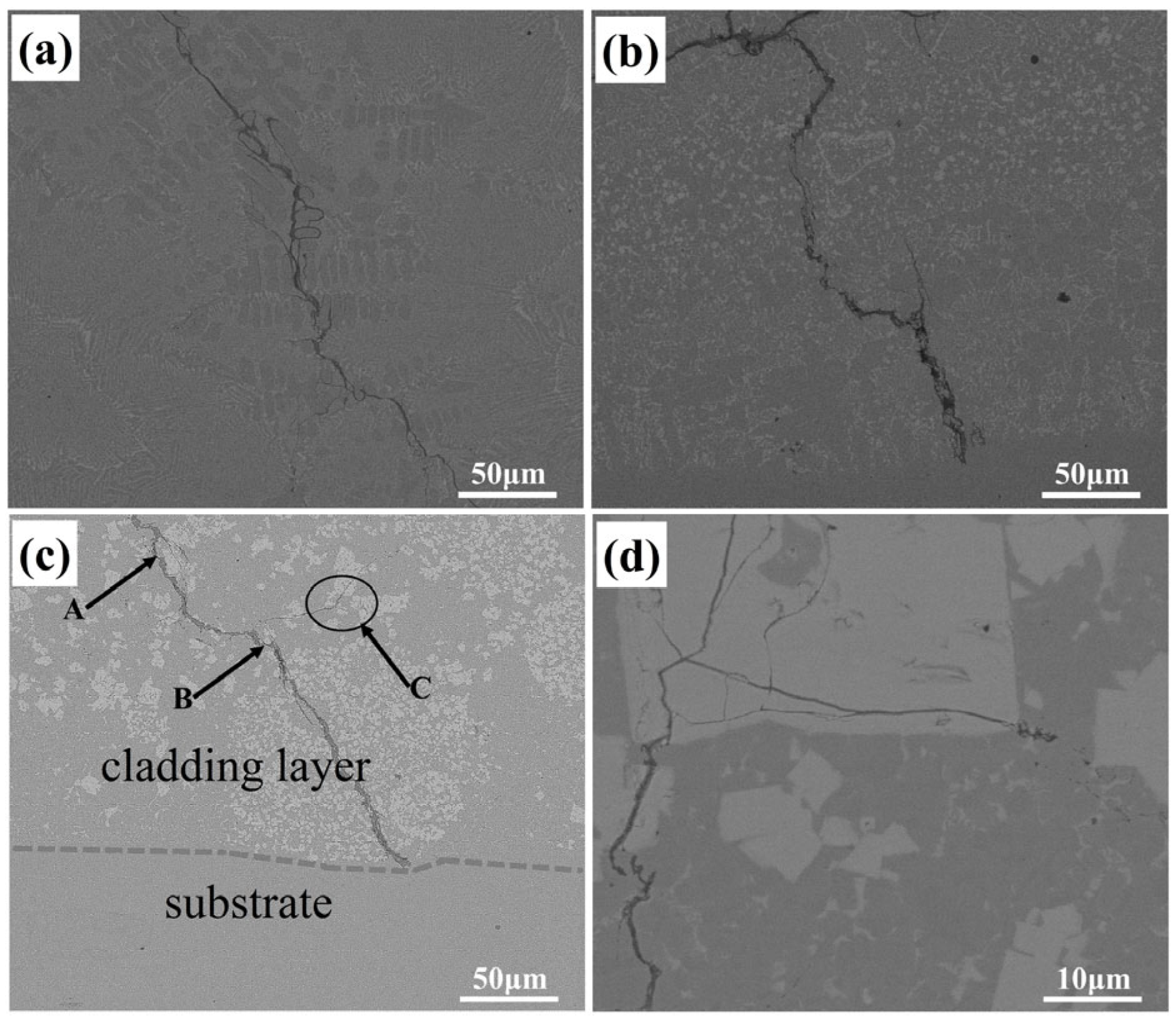 Overall, the cladding layer exhibited both transgranular and intergranular crack propagation. The grain boundary with large interfacial energy, when the cracks propagated to the small hard phases, then the crack propagation patterns of the cladding layer were intergranular propagation. However, the interfacial energy of the grain boundary can be ignored when the cracks propagate into the large hard phases, resulting in the transgranular propagation of the cracks.