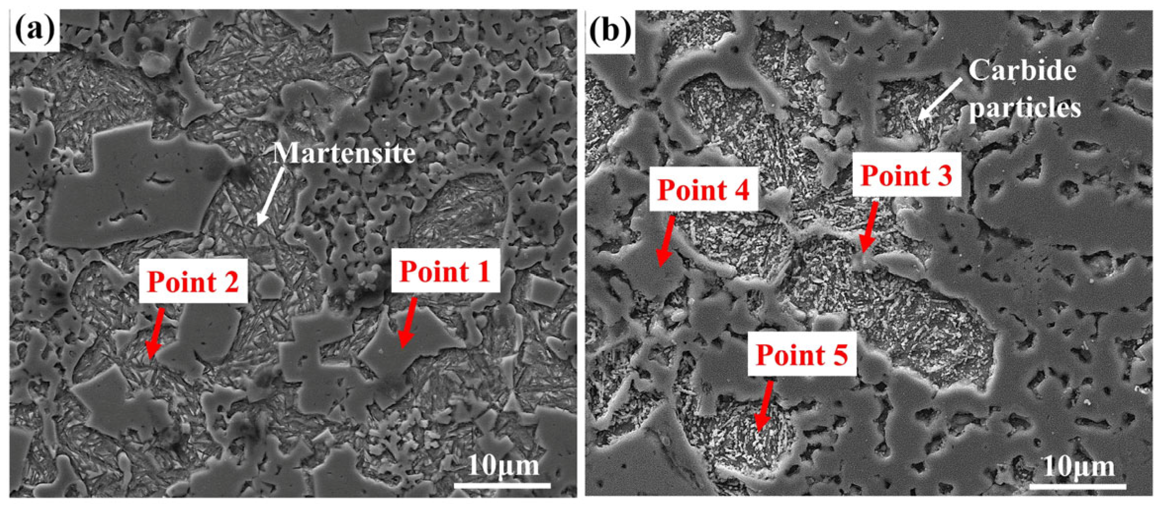 Figure 8 shows the microstructure of the cladding layer with different thermal fatigue conditions. The element composition, as marked in Figure 8, is shown in Table 4. The binder phases of the cladding layer without thermal fatigue in Figure 8a were martensite. The hard phases were composed of Mo2FeB2 particles with different sizes and morphology, M3B2, and borides with short rod shape, bone shape, and reticular shape.