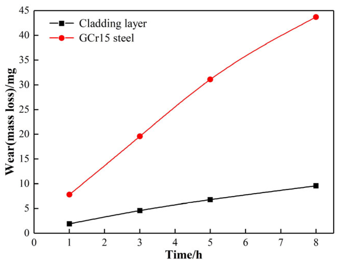 Table 5. Mass loss of the cladding layer and GCr15 steel with different wear times.