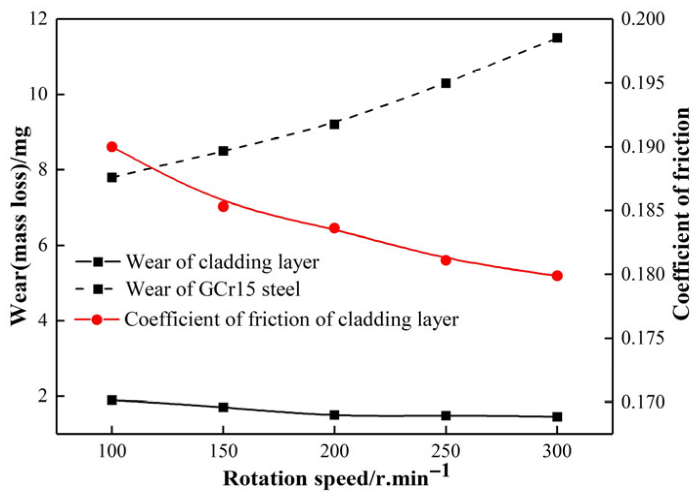 Table 7. Mass loss of the cladding layer and GCr15 steel at different rotation speeds.