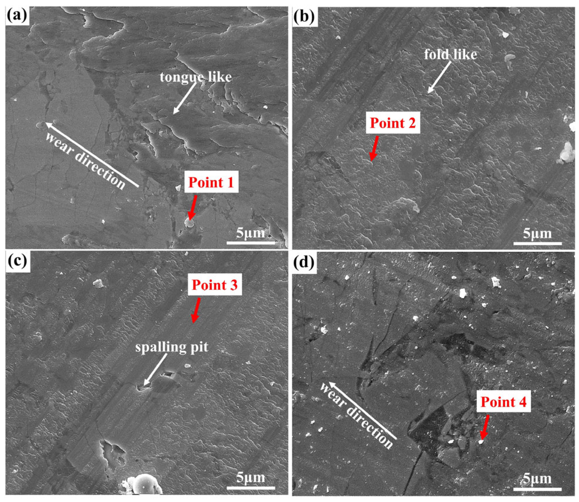 Figure 14 shows the worn surface morphologies at different wear times. The element composition of the marked area in Figure 14 is shown in Table 8. It can be observed that the surface of the binder phase forms traces of tongue-like plastic flow, as shown in Figure 14a. The oxide film was formed at the binder phase with low hardness during the friction process. Because of the shear forces, adhesive wear was generated along the direction of friction following the oxide-induced plastic flow. However, the hard phase possessed high hardness and good stability, and remained largely unchanged. Figure 14b shows that the tongue-like oxide was damaged to form fold-like distributions over the worn surface with shallow plowings. It can be seen in Figure 14c that the fold-like oxide was abraded significantly. The boride hard phases were peeled off from the surface and formed cracks, which participated in the abrasive process to form three-body abrasion wear. When the wear time increased to 8 h, the worn surface no longer displayed fold-like oxide or plowing, as shown in Figure 14d. The spalling pits on the worn surface were observed, indicating that the surface oxide was destroyed.
