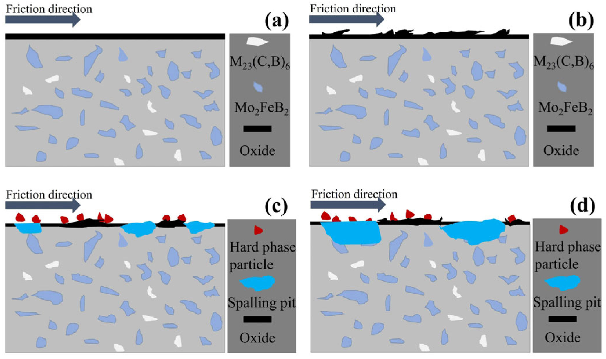 Figure 15 shows the schematic diagram of the wear mechanism of the cladding layer. As shown in Figure 15a, a thin oxide layer formed on the cladding surface due to frictional heat in the initial wear stage. This oxide adhered to the worn surface and served as protection and lubrication [32]. As abrasion continued, the surface temperature increased, softening the binder phase. Due to the shear force, the tongue-like oxide shifted along the friction direction, causing micro-adhesive wear, as shown in Figure 15b. Figure 15c exhibited the condition of further abrasion, where the adhesive wear became apparent, and the tongue-like oxide was destroyed and transitioned to be fold-like. Hence, a large amount of wear debris was inserted into the surface of the oxide to form plowings. Meanwhile, the hard phases with Mo2FeB2 and M23(C,B)6 produced micro-cracks and peeled off under the compressive stress and shear forces, which resulted in the coating generating brittle flaking pits, and the hard phase particles that flaked off mixed on the friction surface to form three-body abrasion wear. Further extending the wear time to 8 h, the hard phase particles staying on the worn surface accelerated the wear of the cladding layer, as shown in Figure 15d. The oxide protective layer on the surface was destroyed, and the plowing expanded, which resulted in the surface tending to become flat eventually. In addition, due to the lack of oxide to protect the hard phase particles from bulging, more hard phase particles peeled off brittlely and formed large spalling pits. It can be seen that the wear of the cladding layer was mainly three-body abrasion wear caused by the brittle spalling of hard phases, while the oxide film formed on the binder phase acted as a self-lubricating layer, enhancing wear resistance.