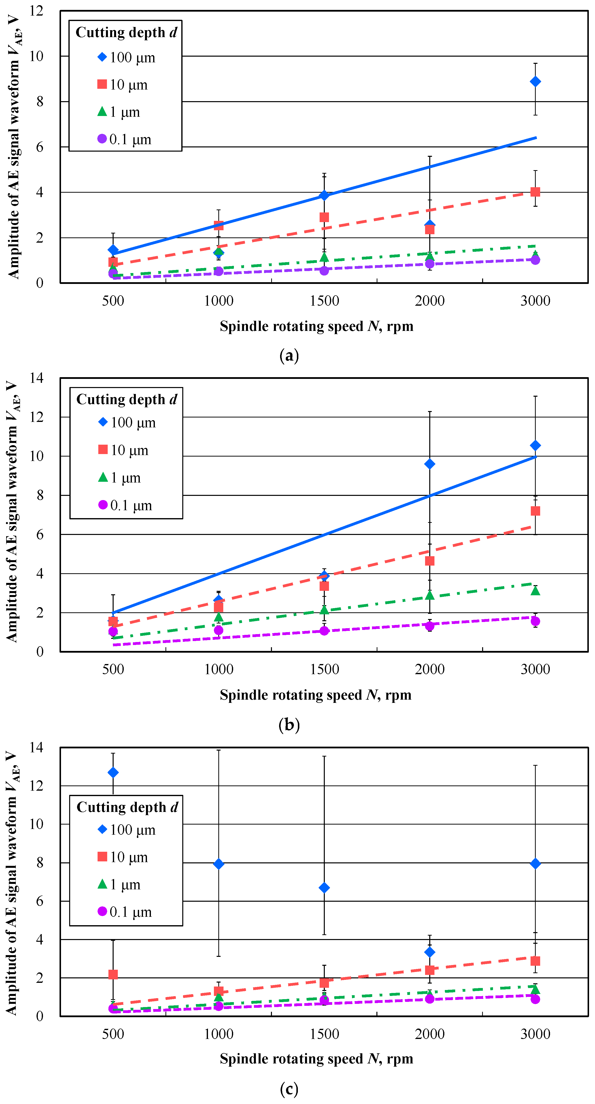 3.3. Effect of the Spindle Rotating Speed and the Cutting Depth on the AE Signals