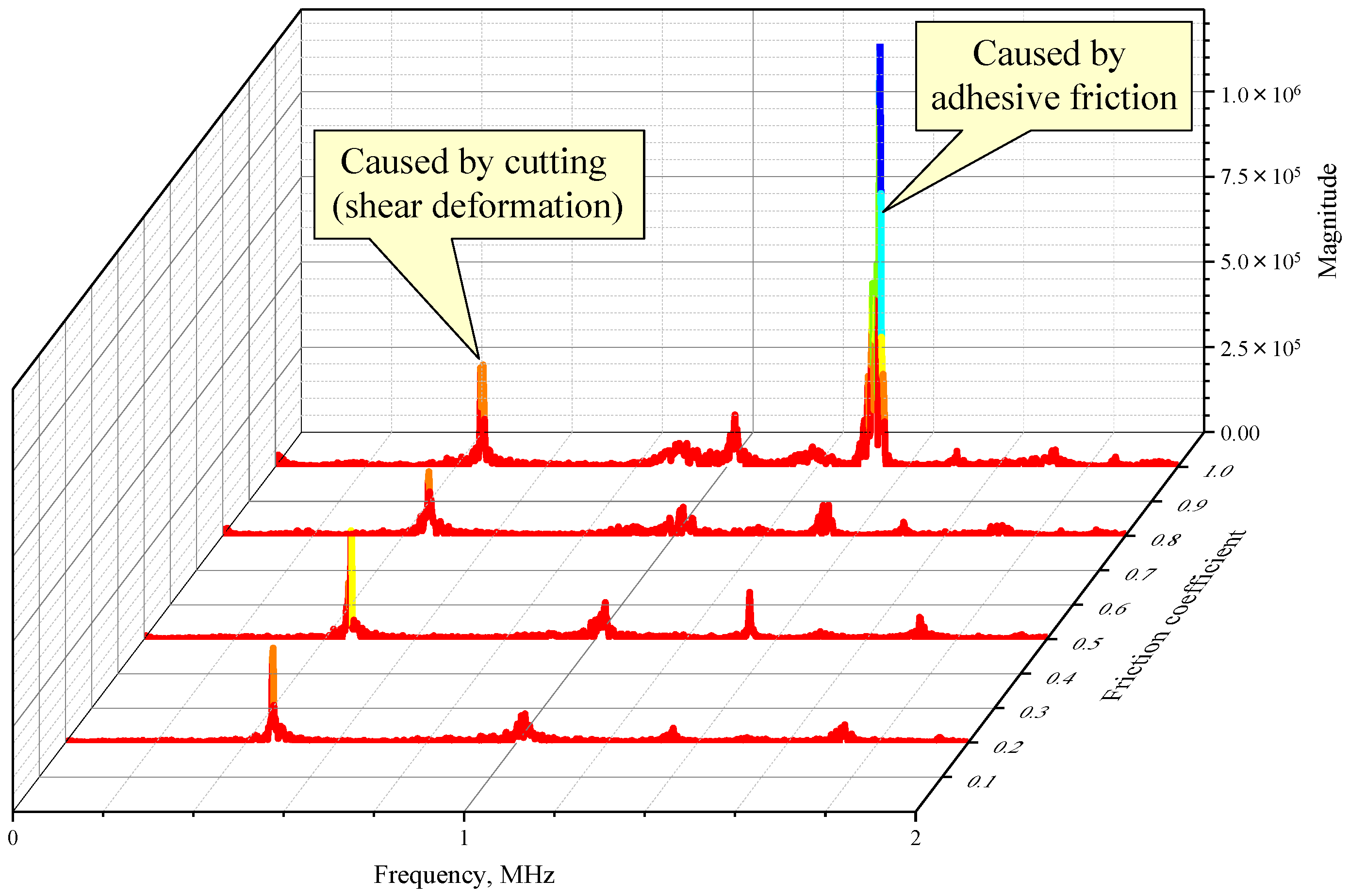 - The frequency spectrum of cutting forces obtained via FEA under high-friction conditions was found to be similar to the frequency spectrum of AE signals recorded during adhesion in cutting experiments.