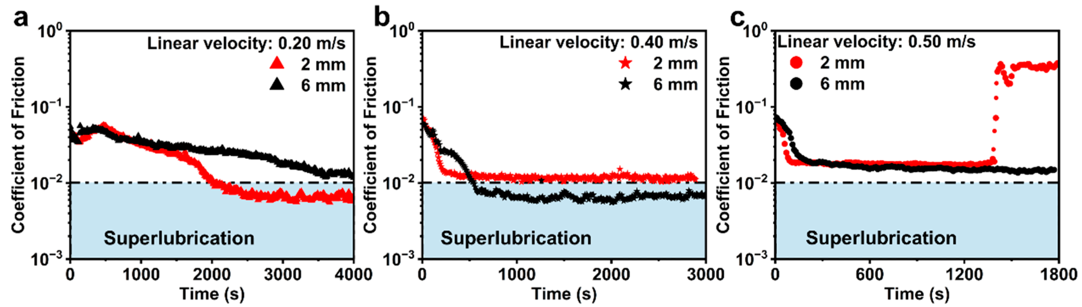 - Xiao, C.; Li, J.; Chen, L.; Zhang, C.; Zhou, N.; Qian, L.; Luo, J. Speed dependence of liquid superlubricity stability with H3PO4 solution. RSC Adv. 2017, 7, 49337–49343. [Google Scholar] [CrossRef]