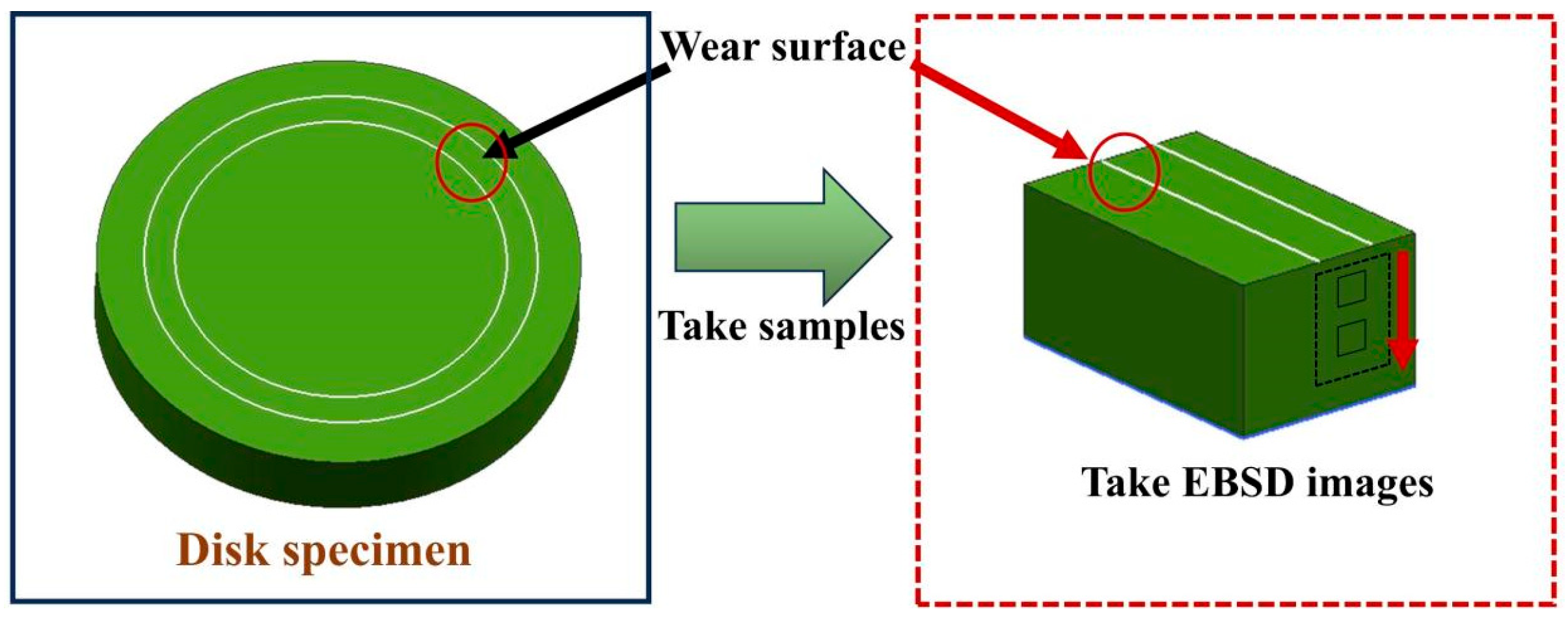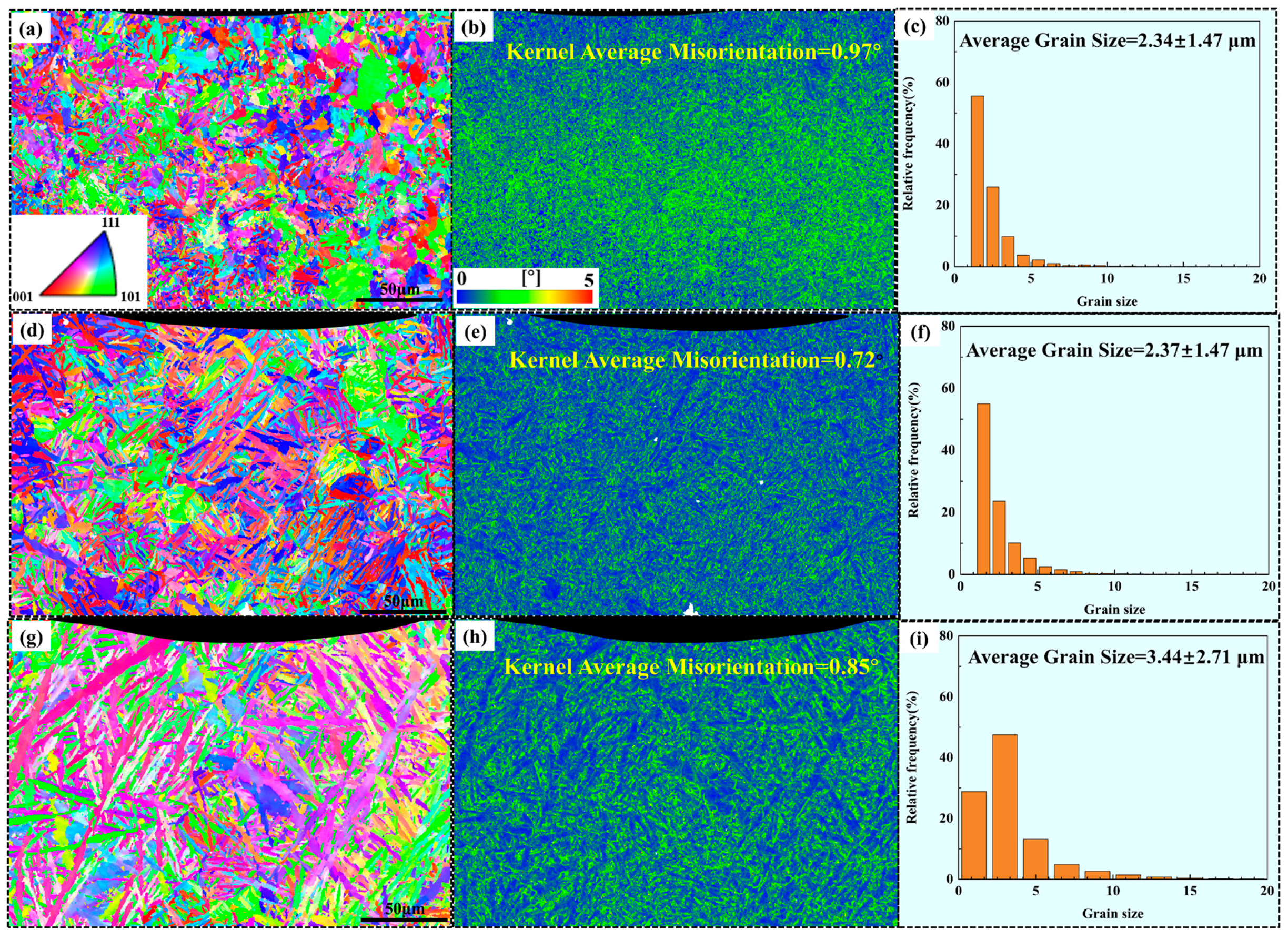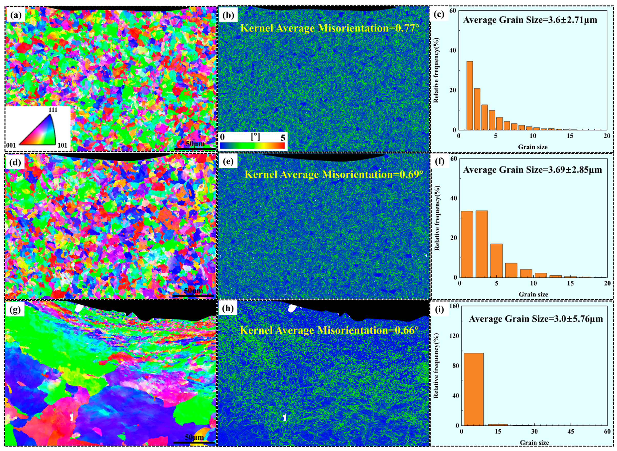 - Under high-temperature friction and wear at 1000 °C, H13 and 5CrNiMo tool steels exhibit distinctly different subsurface evolution paths. In H13 steel, the brittle Cr-rich oxide film formed at high temperature frequently cracks and spalls during friction, leading to repeated exposure of the surface and localized strain concentration, which inhibits continuous recrystallization and results in prolonged frictional instability and severe wear. In contrast, for 5CrNiMo steel, increasing the load drives continuous recrystallization, rapidly transforming the surface layer through plastic deformation and recrystallization into a low-dislocation-density, equiaxed mechanically mixed layer. At high temperature, this layer exhibits compliance and combines with oxide debris, promoting the formation and maintenance of a dense third-body layer.