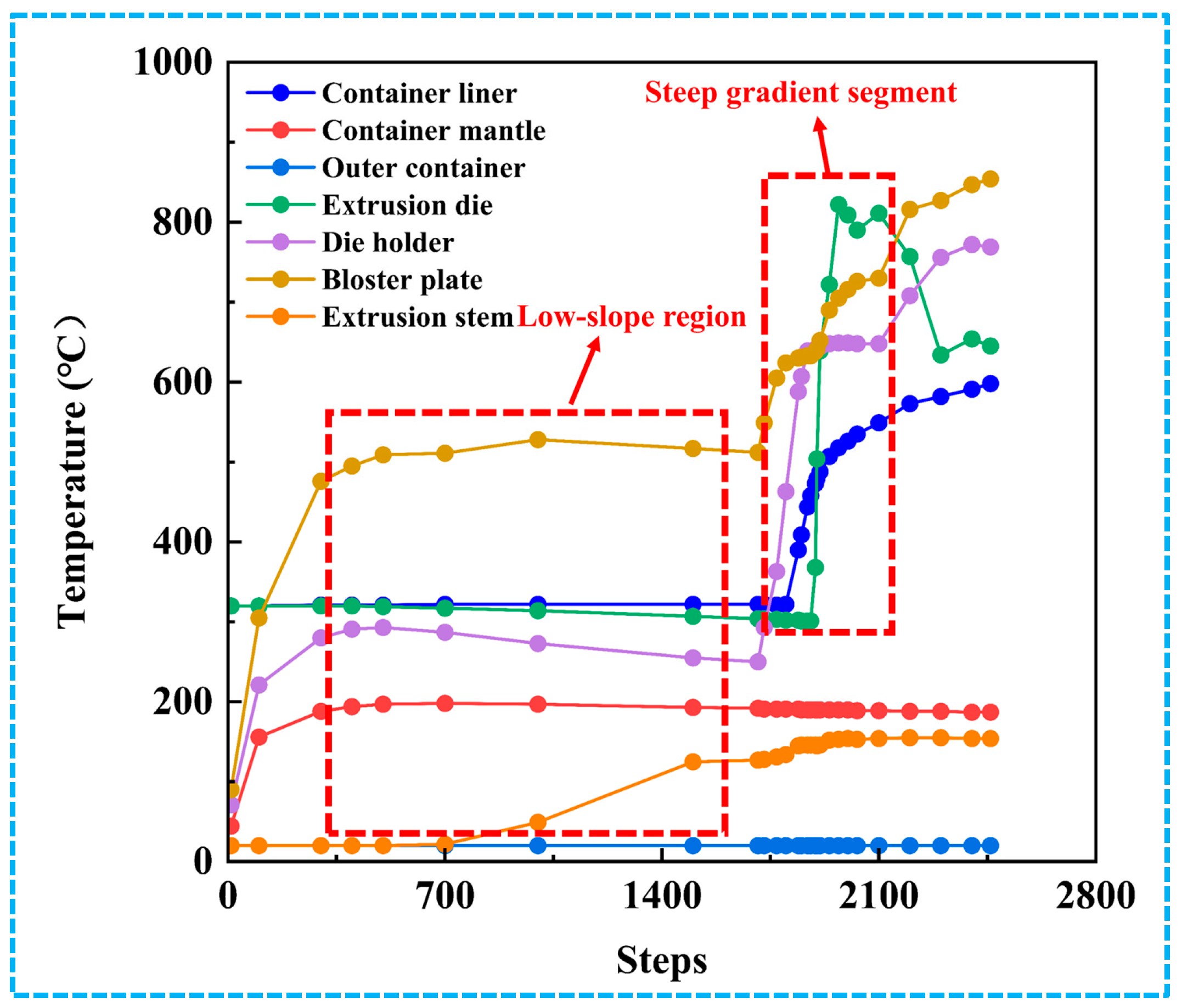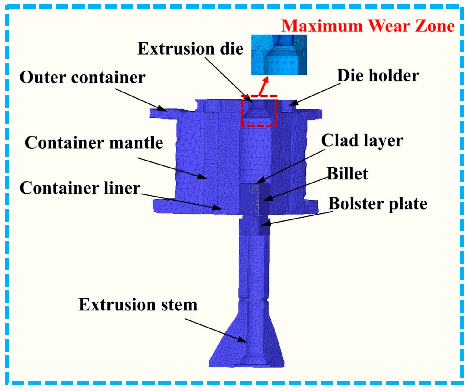 - Simulation results indicate that the die exit is the primary wear and failure location in the extrusion system due to the combined effects of contact pressure, relative sliding, and thermal load. Localized stress concentrations in the die holder, bolster plate, container liner, and extrusion stem suggest that targeted improvements in material selection, surface treatment, and lubrication should be considered.