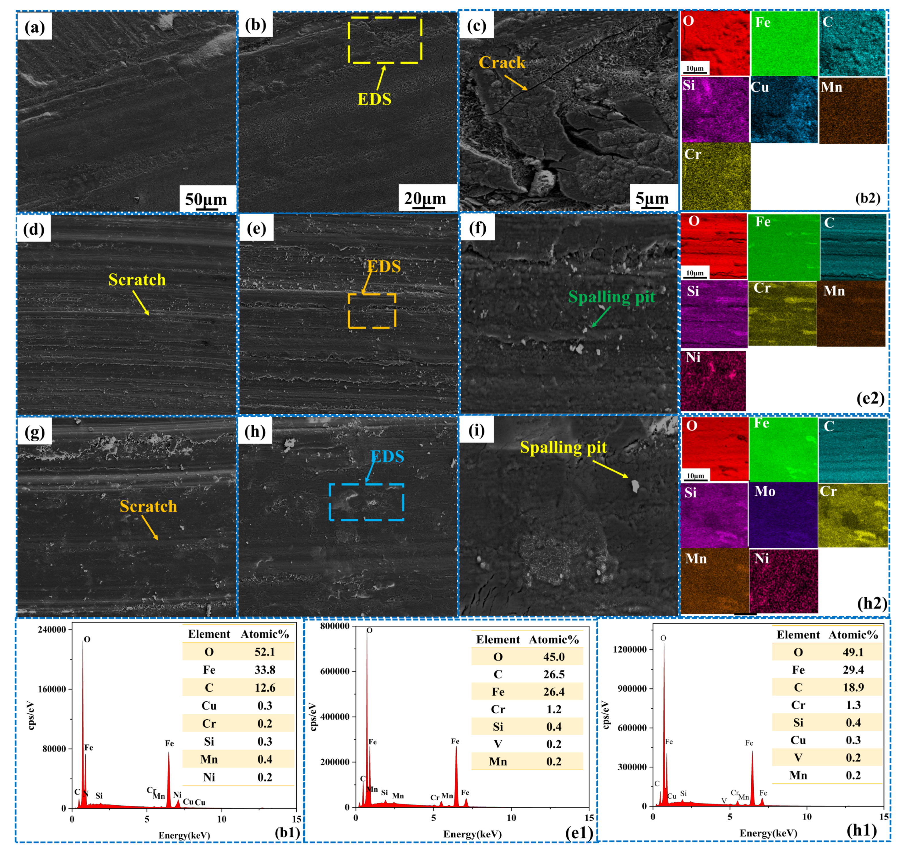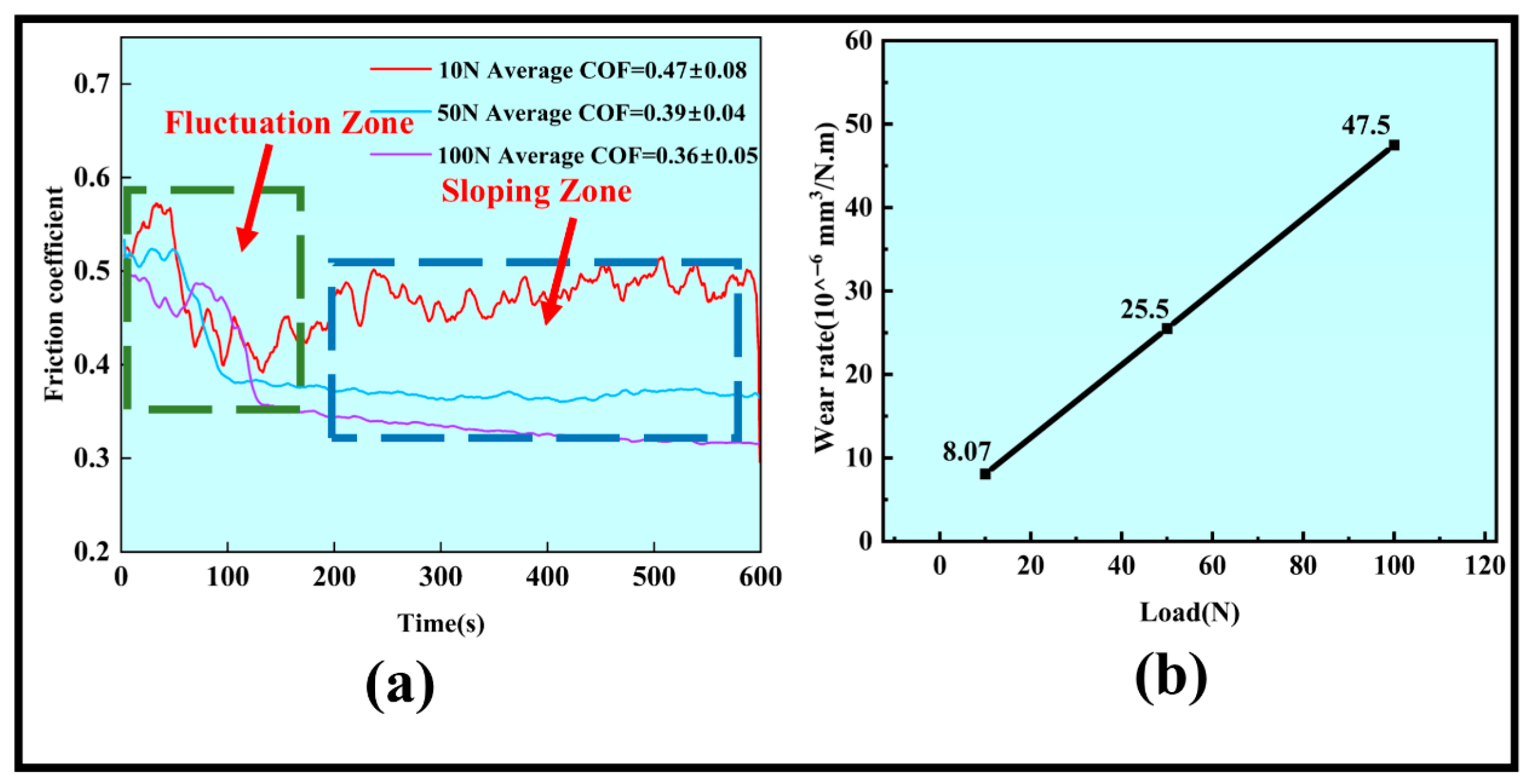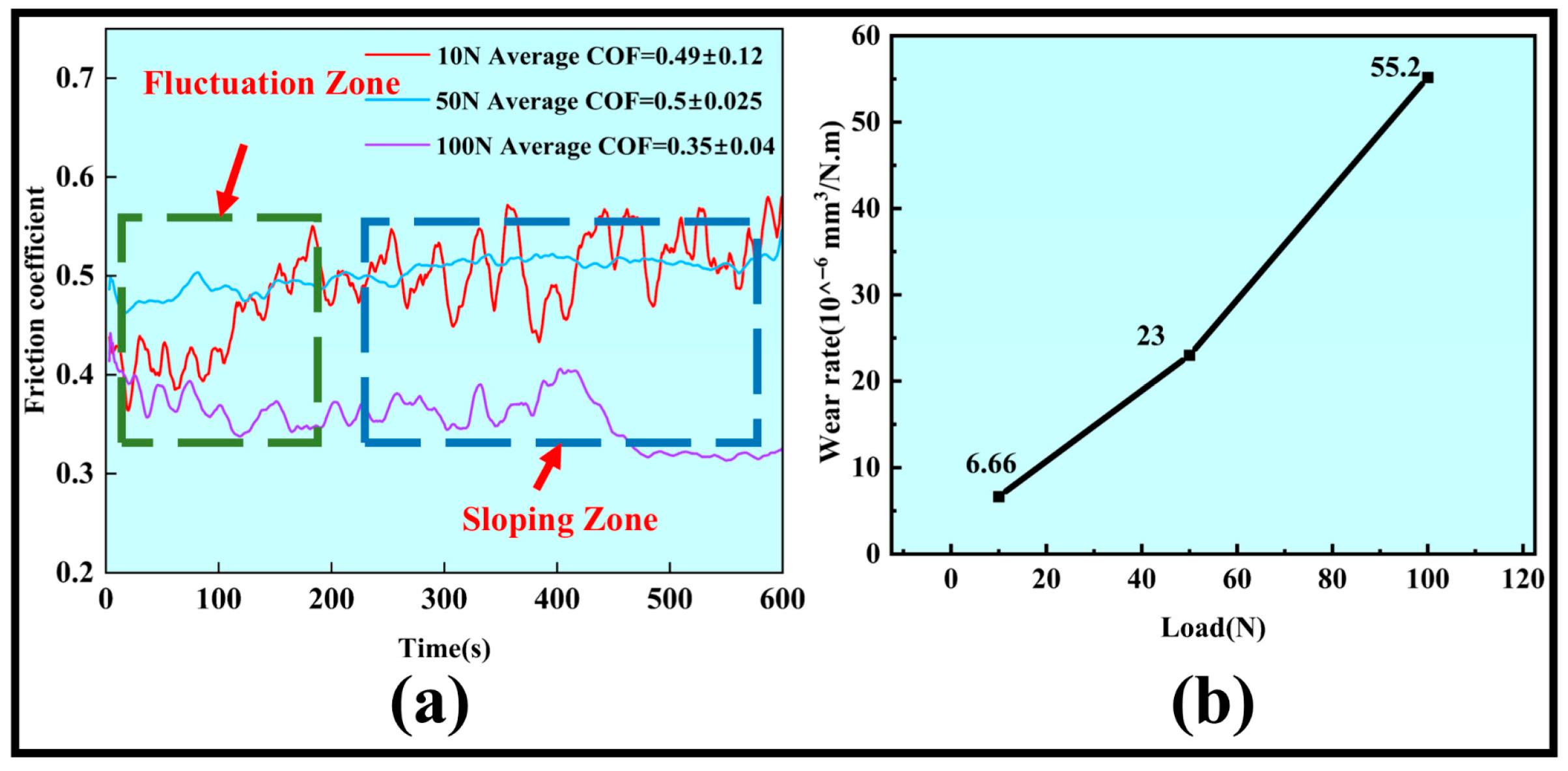 - Under high-temperature friction at 1000 °C, both H13 and 5CrNiMo tool steels exhibit a general decrease in friction coefficient with increasing load; however, significant differences are observed in their fluctuation behavior. This is attributed to differences in high-temperature oxidation behavior, the formation and compaction efficiency of the third-body layer, and the high-temperature plasticity of the substrate. Overall, at high loads, the increased real contact area and the compaction of debris and oxides contribute to a reduction in the friction coefficient.
