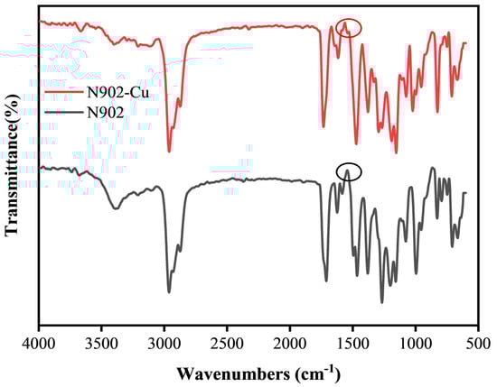Fourier transform infrared (FTIR) spectra of Cu nanoparticles and N902. The circles indicate the stretching vibration peaks of the carbonyl group (C=O), illustrating the peak shift and merger due to surface coordination.