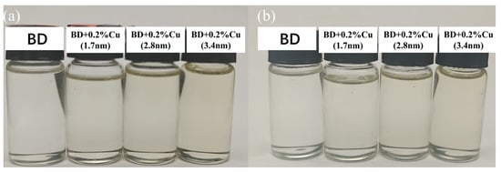 Figure 5 shows the optical photographs of copper nanoparticles with three different particle sizes dispersed in biodiesel at an addition level of 0.2%. After standing for 15 days, the system still maintained good uniformity, which further confirms that N902 modification significantly improved the dispersion stability of nano-copper in biodiesel.