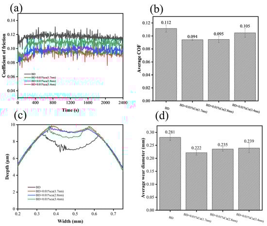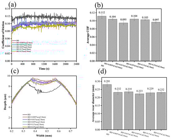 Tribological performance of 2.8 nm Cu at different concentrations: (a) friction coefficient curves, (b) average friction coefficient, (c) 2D wear profiles, (d) average wear scar diameter.