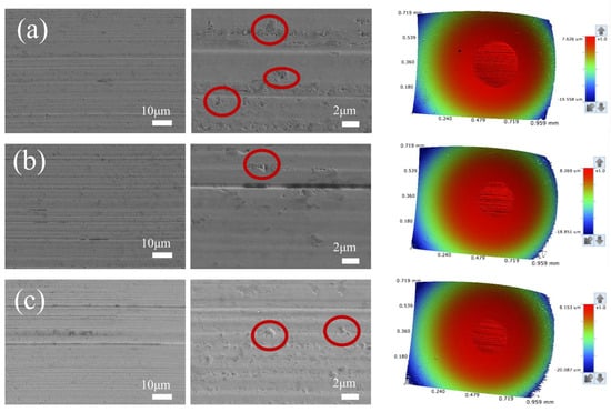 After the friction tests, the steel balls were cleaned with petroleum ether and dried using an air blower. The wear scars on the steel balls were measured using a three-dimensional optical profilometer (3D OP, Contour GT-I30, Bruker, Karlsruhe, Germany). The morphology of the wear surfaces and the distribution of typical surface elements were further analyzed using a scanning electron microscope (SEM, JSM-5600, JEOL, Tokyo, Japan) equipped with an energy-dispersive spectroscopy (EDS) system (X-Max N, Oxford Instruments, Oxford, UK).