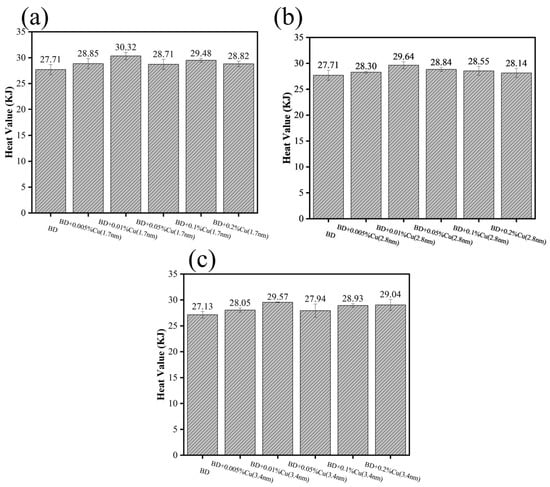 The calorific values measured under oxygen-deficient conditions are presented in Figure 10. Copper nanoparticles of three distinct particle sizes increased the measured calorific value of biodiesel, with the calorific values first increasing and then decreasing as the addition concentration rose. At an addition level of 0.01%, the calorific value improvement was most pronounced: the 1.7 nm sample showed the largest increment, indicating it was most effective in promoting complete combustion, followed by the 2.8 nm sample; the 3.4 nm sample exhibited a relatively weaker promotional effect. As the addition concentration continued to increase, the calorific value declined instead. This trend suggests that the enhancement effect of nano-Cu on combustion is not linear with dosage and that an optimal concentration exists. At higher loadings, the effective contribution of nano-Cu to the combustion process may reach a saturation regime, in which additional nanoparticles no longer provide further enhancement. The detailed mechanisms responsible for this behavior are likely related to the complex and dynamic nature of the combustion process and require further investigation.