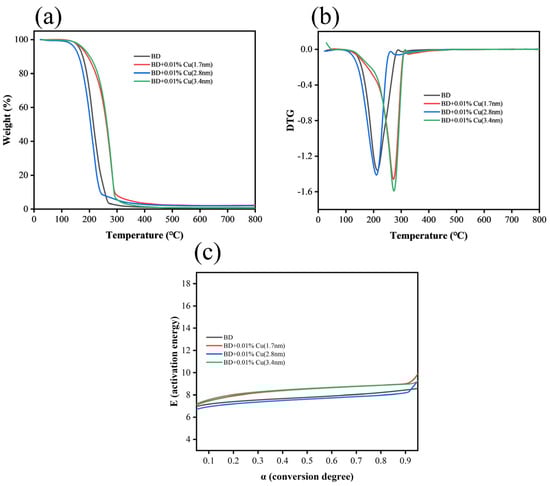 Thermogravimetric analysis (TGA) results of biodiesel and Cu nanoparticle-doped mixed fuels (1.7 nm, 2.8 nm, 3.4 nm): (a) Thermogravimetry (TG) curves, (b) Derivative thermogravimetry (DTG) curves, (c) E-α kinetic curves.