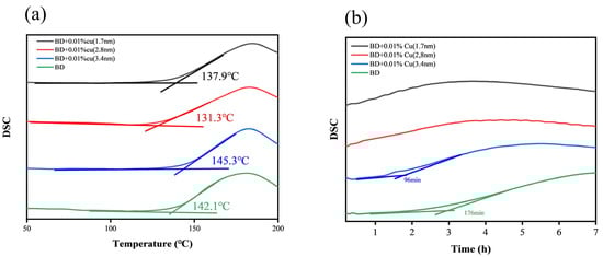 Notably, as shown in Figure 12b, the OIT could be clearly determined for neat biodiesel and for biodiesel containing 3.4 nm Cu nanoparticles. In contrast, for biodiesel containing 1.7 nm or 2.8 nm Cu nanoparticles, the oxidation proceeded too rapidly under the isothermal condition, and a distinct induction period could not be reliably resolved. Nevertheless, the time corresponding to the maximum of the exothermic peak on the DSC curve (time-to-peak) can still be used as a comparative indicator of oxidation reactivity, showing that the 1.7 nm sample reached the peak earlier than the 2.8 nm sample, i.e., it promoted oxidation more strongly.