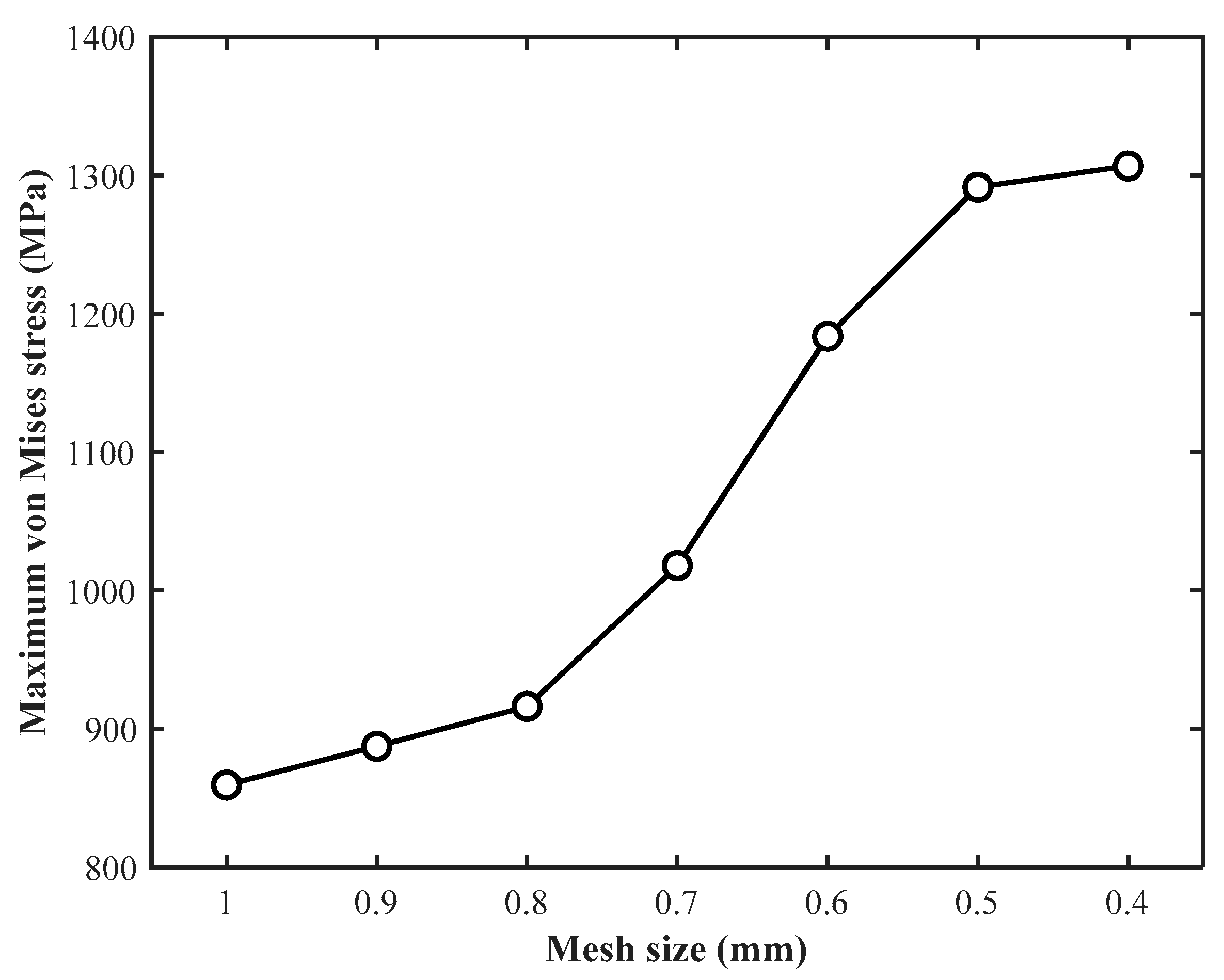 Figure 5 indicate that further mesh refinement leads to progressively smaller changes in the stress magnitude. When the mesh size is reduced from 0.5 mm to 0.4 mm, the variation in the maximum stress becomes negligible, indicating that mesh convergence has been achieved. Therefore, a mesh size of 0.5 mm is selected for the subsequent finite element analyses, considering both computational accuracy and efficiency.