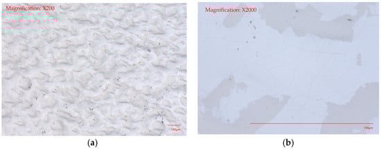 Magnified view of the porosity in the electroplated chrome coating: (a) magnification factor 200× and (b) magnification factor 2000×.