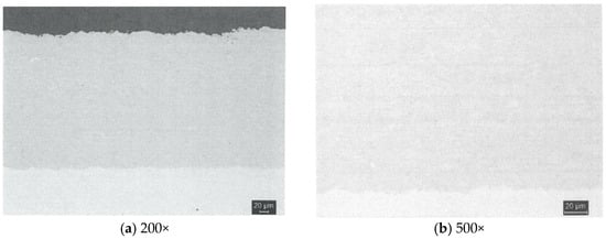 The counter-wear ring surface was electroplated with hard chromium in accordance with the requirements of AMS 2406 [23]. Figure 4 shows a cross-sectional view of electroplated chrome. Figure 5 shows a magnified view of the porosity in the electroplated chrome coating. The coating exhibited a thickness of 0.24 mm, an average porosity of 0.03%, and a surface roughness of Ra 0.02–0.04. The average bonding force is 20.15 N, with a microhardness of 986 HV0.3.