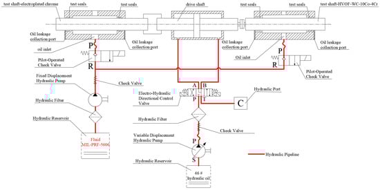 The schematic diagram of the test setup is shown in Figure 9. The central unit is a driving hydraulic cylinder, which actuates the left and right test hydraulic cylinders to perform reciprocating motion. Lubricating oil is pressurized by an oil supply system (tank-pump) independent of the driving hydraulic cylinder and then introduced from the central oil port of the test hydraulic cylinders. The piston rod of the left test hydraulic cylinder is coated with electroplated chromium, while the piston rod of the right test hydraulic cylinder is coated with HVOF-sprayed WC-10Co-4Cr. One test seal product is installed on each side of the test hydraulic cylinder and leakage collection ports are machined outside the test seal products to collect oil leakage (the test method for leakage is in accordance with ISO7986 [24]).