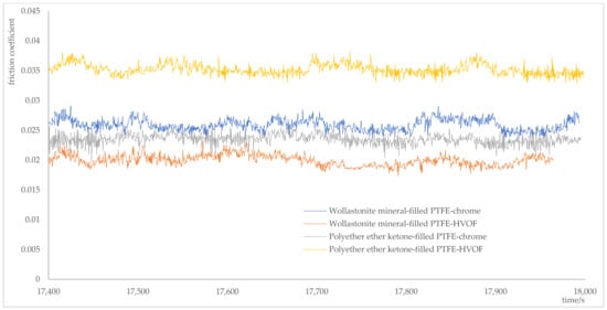 As shown in Figure 13, under dry sliding conditions, the friction coefficients of the two materials on different surfaces followed the following descending order: wollastonite mineral-filled PTFE-HVOF-sprayed WC-10Co-4Cr coating > wollastonite mineral-filled PTFE-electroplated chrome > polyether ether ketone-filled PTFE-HVOF-sprayed WC-10Co-4Cr coating > polyether ether ketone-filled PTFE-electroplated chrome. As shown in Figure 14 and Figure 15, under oil-lubricated conditions, after reaching a steady state, the ranking of the friction coefficients was as follows: polyether ether ketone-filled PTFE-HVOF-sprayed WC-10Co-4Cr > wollastonite mineral-filled PTFE-electroplated chrome > polyether ether ketone-filled PTFE-electroplated chrome > wollastonite mineral-filled PTFE-HVOF-sprayed WC-10Co-4Cr.