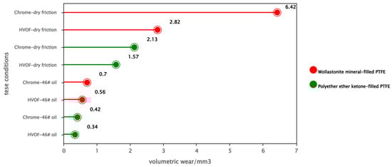 The volumetric wear amounts of the two PTFE materials after rubbing against an electroplated chrome surface and a HVOF-WC-10Co-4Cr surface under different lubrication conditions was measured using the method in Section 2.1, Equation (2), the test results were shown in Figure 16.
