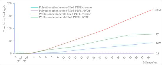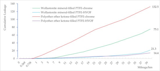 Cumulative leakage volumes of wollastonite mineral-filled PTFE T seals over a 40 km sliding distance on electroplated chrome and HVOF-sprayed WC-10Co-4Cr surfaces are shown in Figure 18.