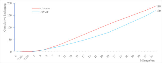 Cumulative leakage volumes of VL seals made from both materials over a 40 km sliding distance on electroplated chrome and HVOF-sprayed WC-10Co-4Cr surfaces are shown in Figure 17.