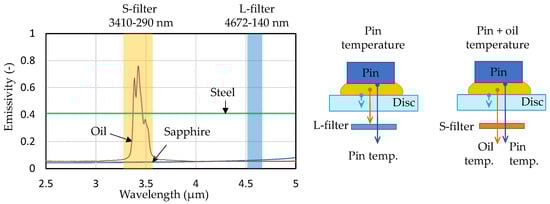 A key aspect of this study is the implementation of an infrared (IR) thermography method for temperature measurement in the sliding contact. To enable separation of the radiation emitted by the steel pin and the lubricant film, two narrow-band IR filters were used in front of the camera sensor, as illustrated in Figure 4. The first filter (denoted S-filter) had a passband centered at 3.410 µm (bandwidth 290 nm) and allowed the combined infrared emission from the oil and the steel pin to be recorded. The second filter (L-filter), centered at 4.672 µm (bandwidth 140 nm), was chosen such that it predominantly transmitted radiation from the steel pin while largely excluding the oil’s emission band (since lubricating oil emits IR strongly in a narrower wavelength range around ~3.4 µm). By alternating these filters, it was possible to capture two sets of IR images: one showing the pin’s surface temperature (L-filter) primarily, and another containing both the pin’s and oil’s contributions (S-filter). Tests were also performed without any filter in the optical path to record the overall radiation as a baseline. There is also the option of measuring the temperature of the disc using a fully reflective chrome coating [18,19]; however, this approach was not used due to the wear and degradation of the coating under demanding test conditions.