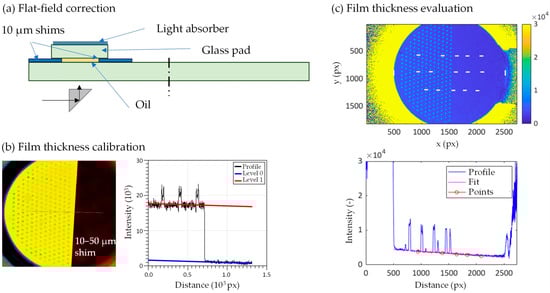 Scheme of the calibration and evaluation procedure for the fluorescence microscopy: (a) Flat-field correction, (b) Film thickness calibration and (c) Film thickness evaluation.