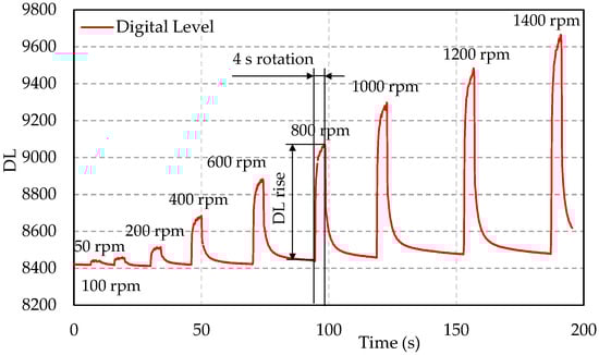 Evolution of the IR camera digital level (DL) in the Stribeck curve measurement cycle for one load, including 4 s rotation periods and cooling periods.