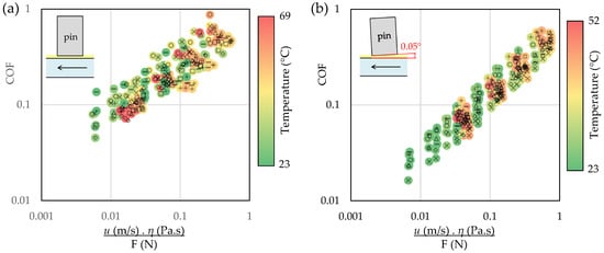 When the correction using in-contact oil temperature is applied, data for all pins and both contact geometries can be plotted together, as shown in Figure 10. In the parallel configuration (Figure 11a), all textured pins and the smooth reference pin fall within a relatively narrow band, with only modest differences between the texture designs. The inclined configuration (0.05°, Figure 11b) yields generally lower COF values and a tighter alignment of points along the power-law trend, indicating more stable hydrodynamic lubrication due to the controlled wedge angle.