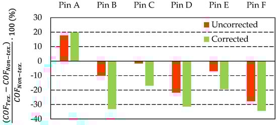 Relative change in the coefficient of friction (COF) of textured pins A–F with respect to the smooth reference pin for the inclined contact. “Uncorrected” values are averaged from the measured COF at identical values of the characteristic number. “Corrected” values are obtained from the power-law fits in Figure 10b, evaluated over the same characteristic-number range, and then averaged.