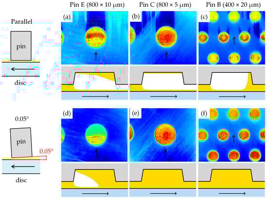 IR images showing local phenomena associated with cavitation in dimples for different pins and contact configurations; the arrows indicate the lubricant flow direction: (a) Pin E, parallel, (b) Pin C, parallel, (c) Pin B, parallel, (d) Pin E, inclined, (e) Pin C, inclined, (f) Pin B, inclined.