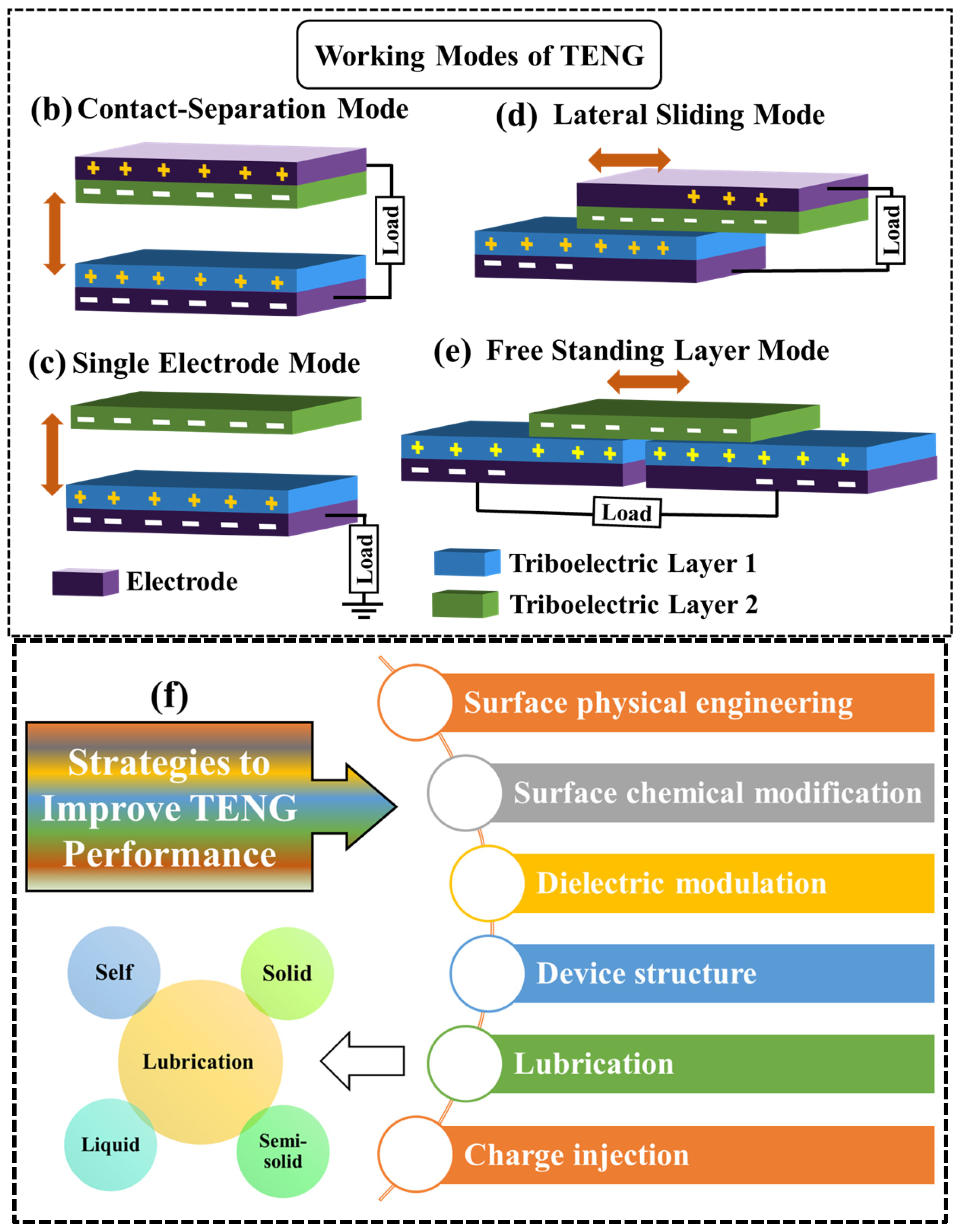 - Design: Liquid lubrication, while capable of mitigating certain challenges in sliding-mode TENGs, needs a special design, and problems such as leakage or evaporation over time may adversely affect electrical output.