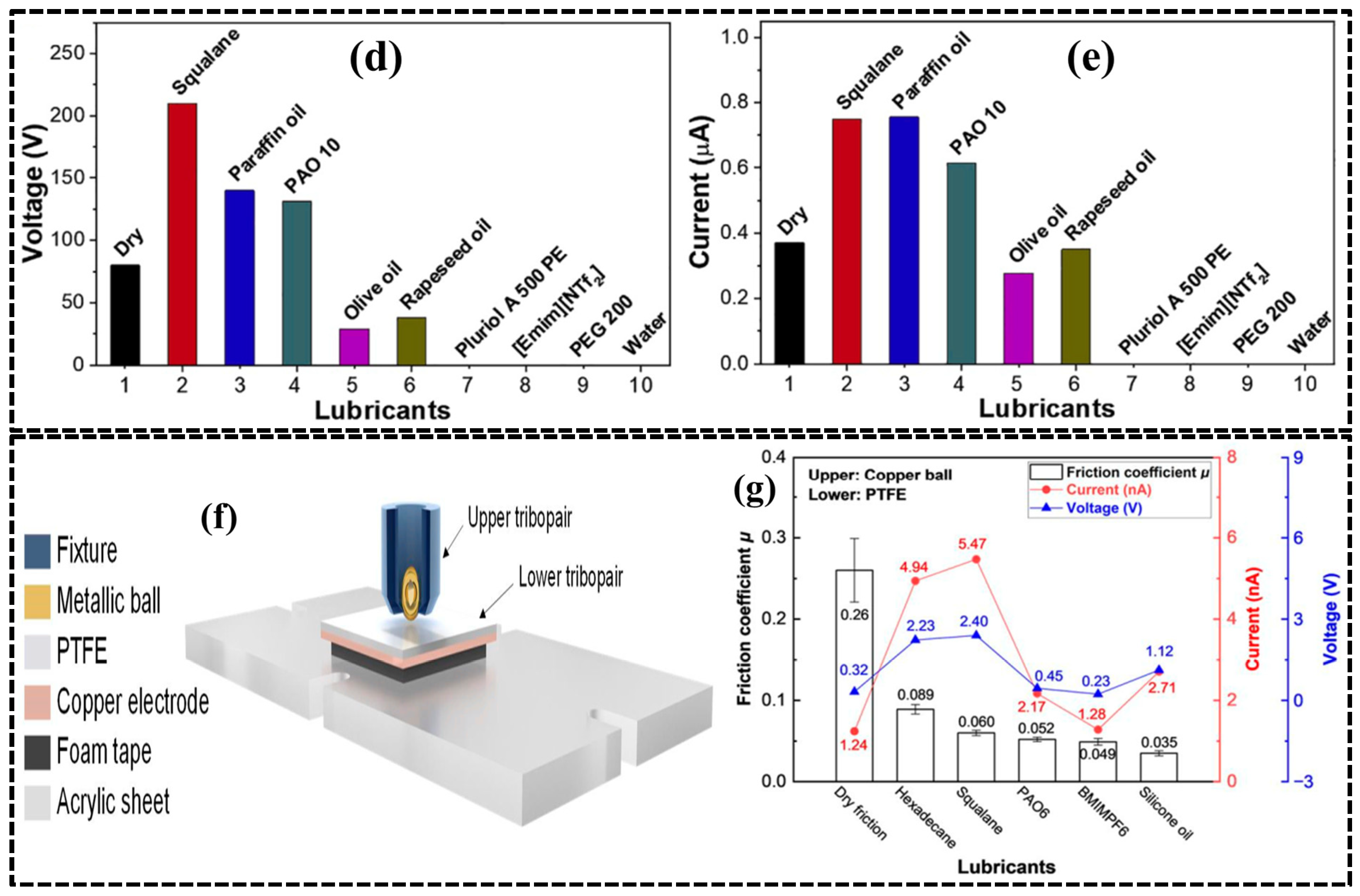 | Ball-Plate Testing | PTFE and copper ball | Dry Hexadecane Squalane PAO6 BMIMPF6 Silicone oil | 5 N, 200 mm/s | 0.26 0.089 0.060 0.052 0.049 0.035 | 0.32 V 2.23 V 2.40 V 0.45 V 0.23 V 1.12 V | 1.24 nA 4.94 nA 5.47 nA 2.17 nA 1.28 nA 2.71 nA | - | - | - | [88] |