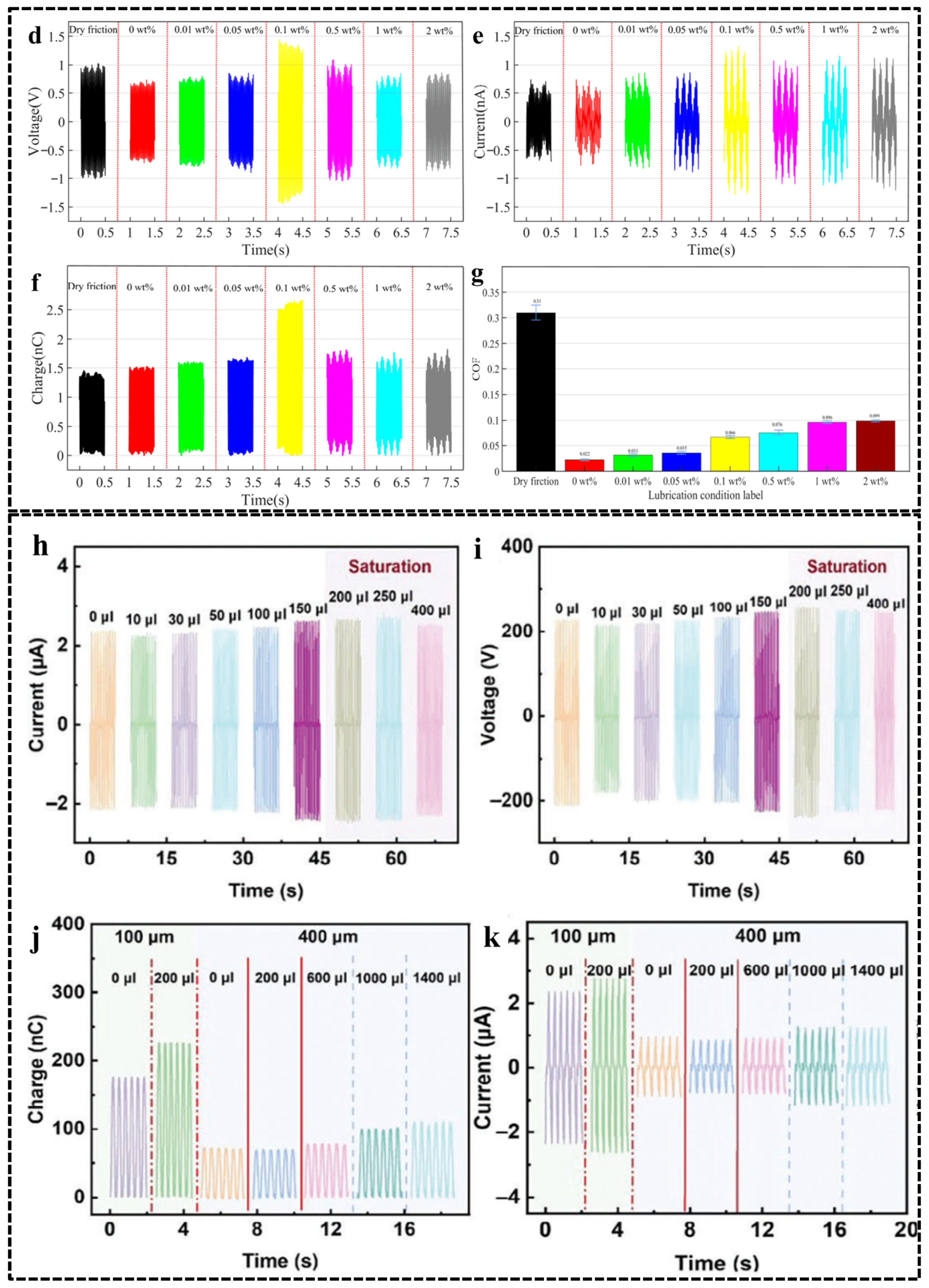 - Chen, J.; Zhao, Y.; Wang, R.; Wang, P. Super-Low Friction Electrification Achieved on Polytetrafluoroethylene Films-Based Triboelectric Nanogenerators Lubricated by Graphene-Doped Silicone Oil. Micromachines 2023, 14, 1776. [Google Scholar] [CrossRef] [PubMed]