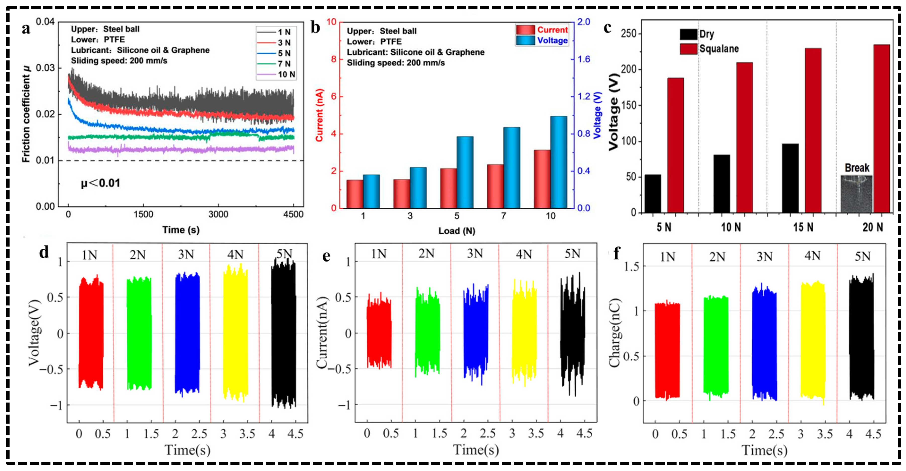 | Reciprocating Ball–Plate | GCr15 and PTFE | Dry | 5 N, 4 Hz | ~0.15@300 sec | - | 0.25 nA | [93] | |||
