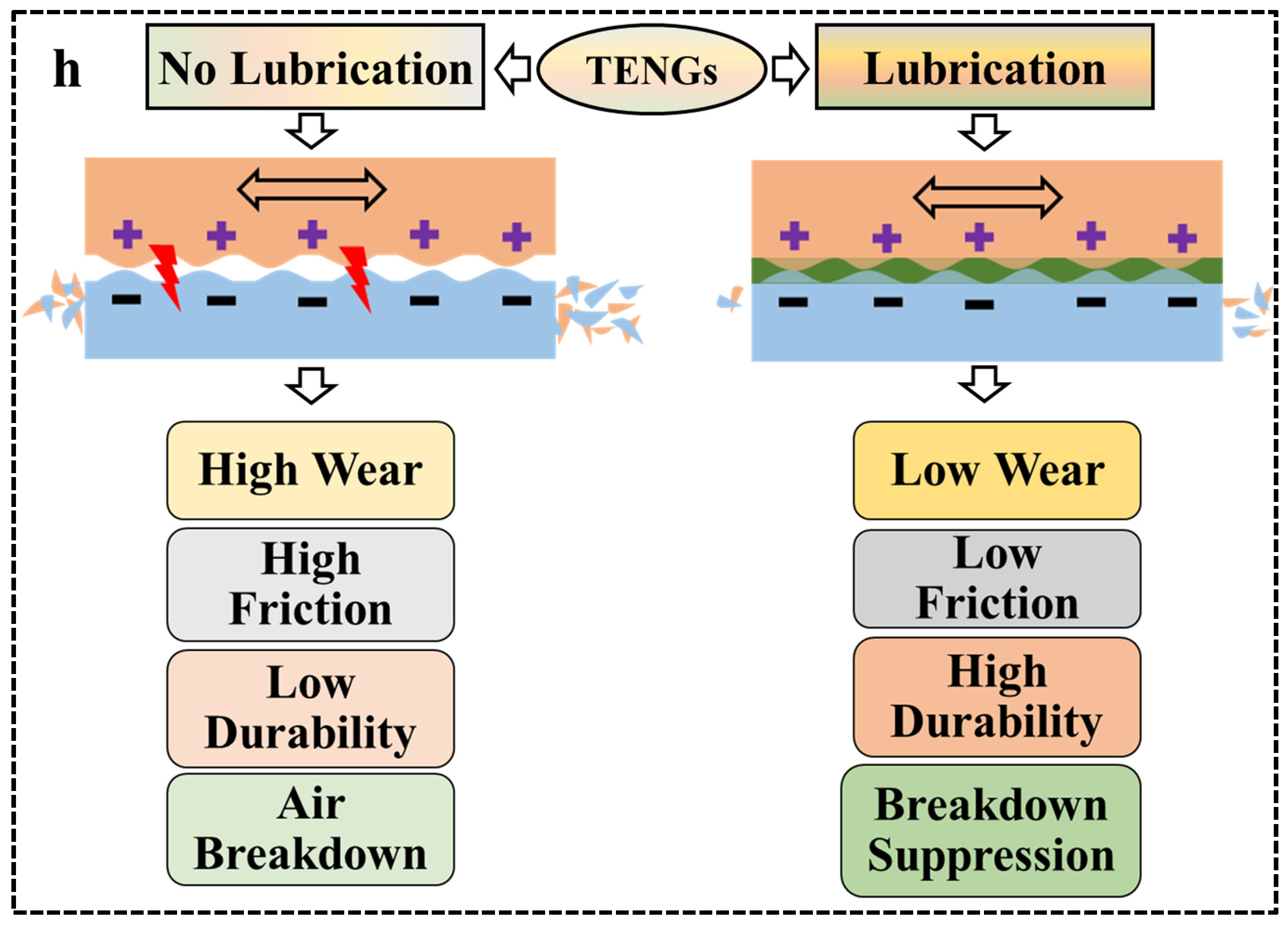 - Compatibility: The compatibility of liquid lubricants with TENG materials, as well as health and environmental concerns, has received less consideration and needs further exploration. Compared to the liquid lubricant, less attention has been given to the solid or semisolid (grease-like) lubricants.