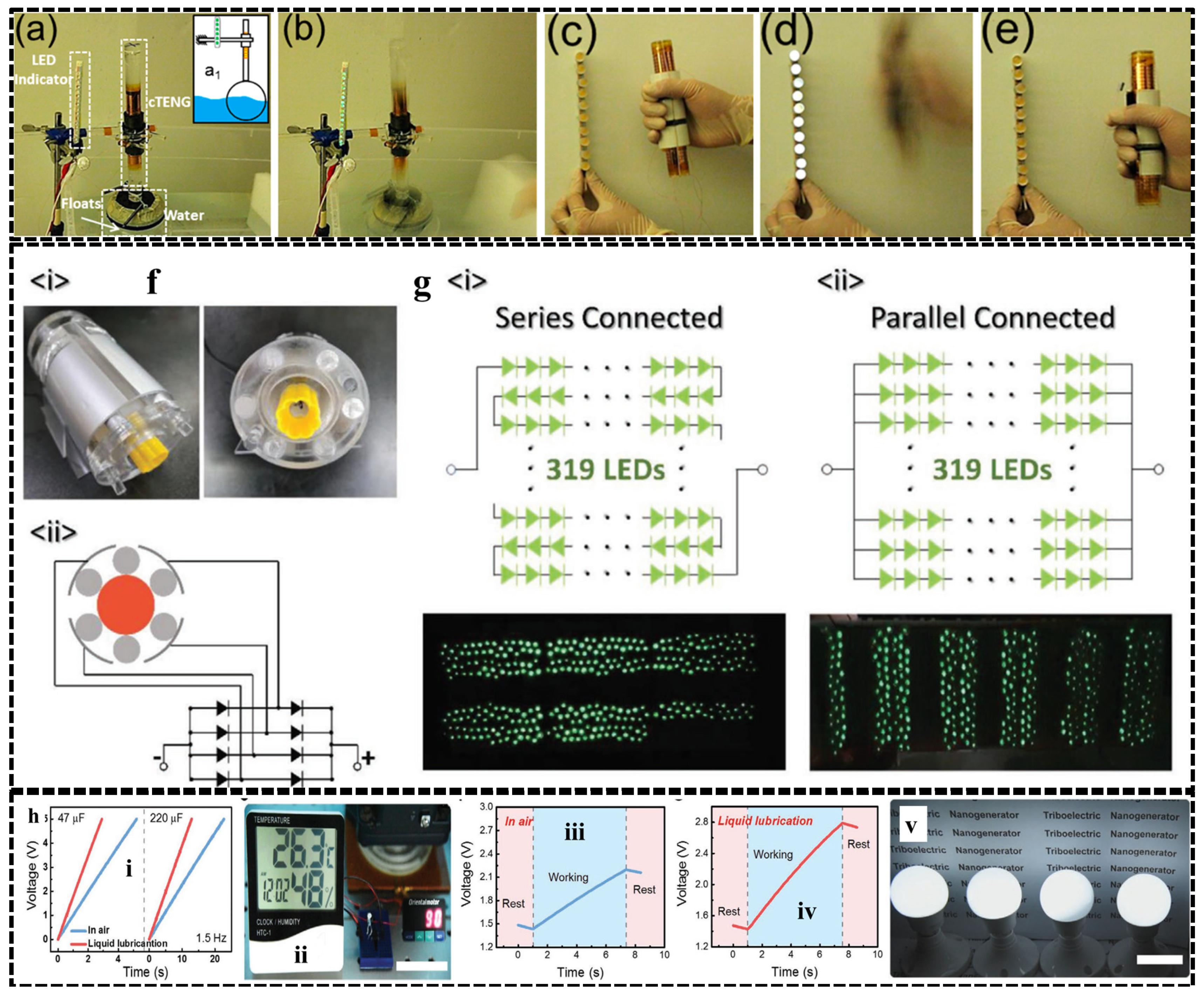 | Rolling Freestanding LLS-TENG | PTFE and Aluminum | Air Mineral oil | - | - | 28 V 200 V | 5 mA 85 mA | - | 72 h | 319 LEDs, charging of capacitors and Li battery | [83] |