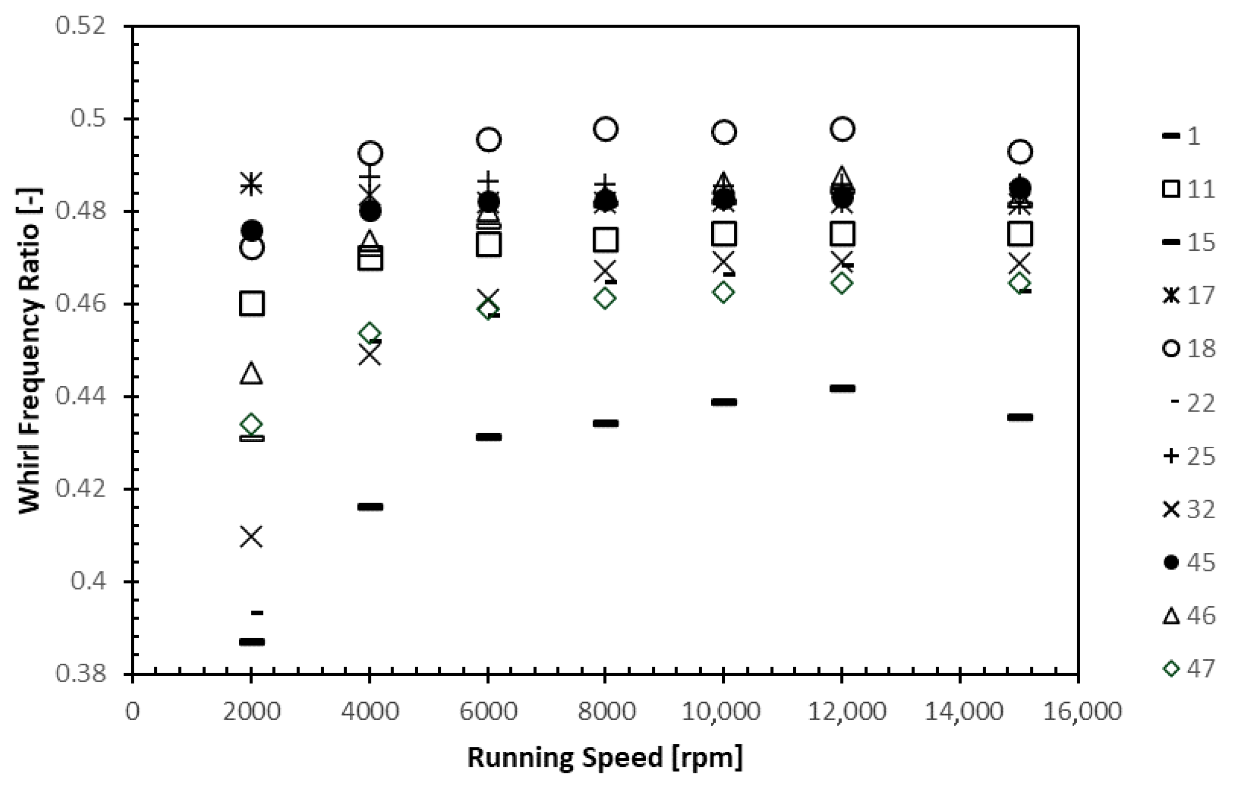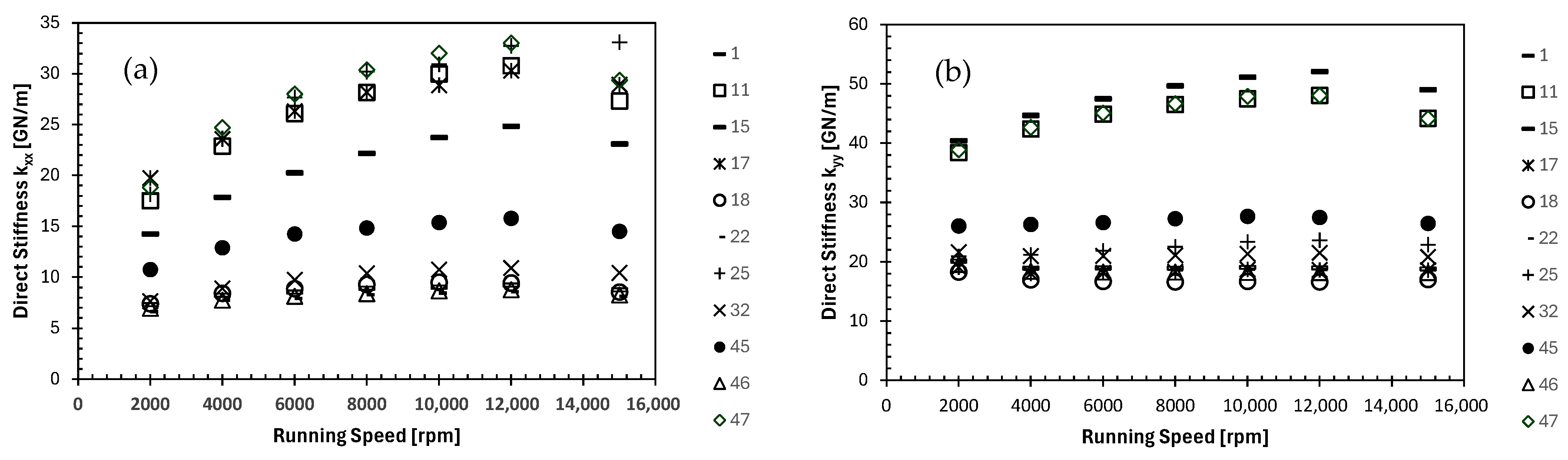 - Urbiola-Soto, L. Multivariate Response Rotordynamic Modeling and Sensitivity Analysis of Tilting Pad Bearings. ASME J. Eng. Gas Turbines Power 2018, 140, 072502. [Google Scholar] [CrossRef]
