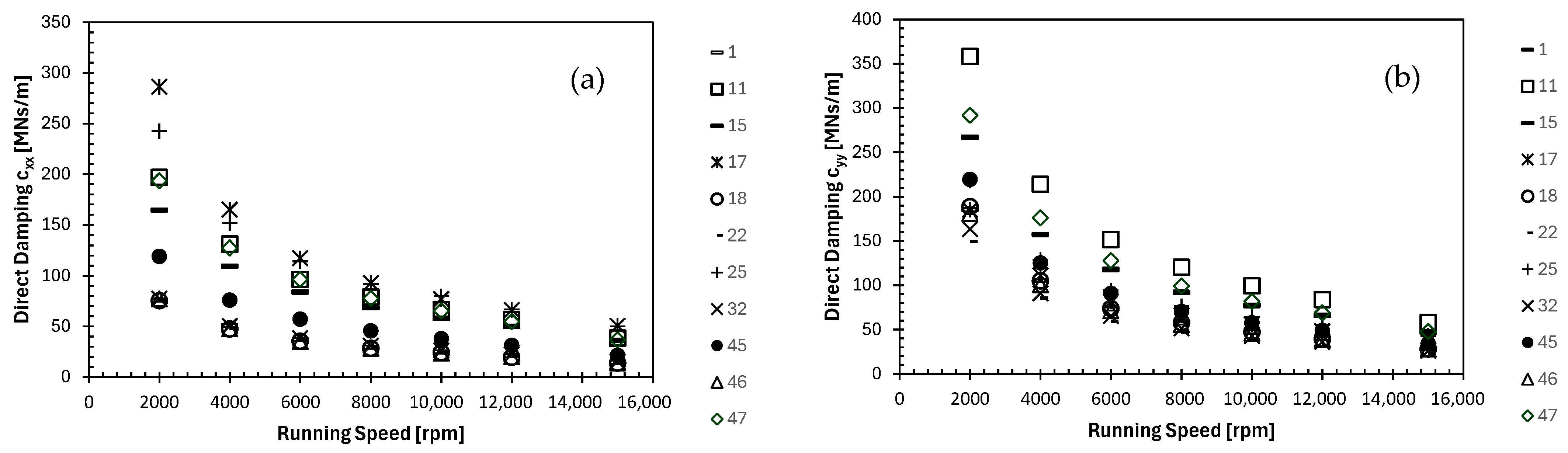 - Nicholas, J.C. Tilting Pad Bearing Design. In Proceedings of the 23rd Turbomachinery Symposium, Dallas, TX, USA, 13–15 September 1994; pp. 179–194. Available online: https://oaktrust.library.tamu.edu/server/api/core/bitstreams/2ed8980c-4e0d-44f8-8c78-97882d54d306/content (accessed on 7 January 2026).