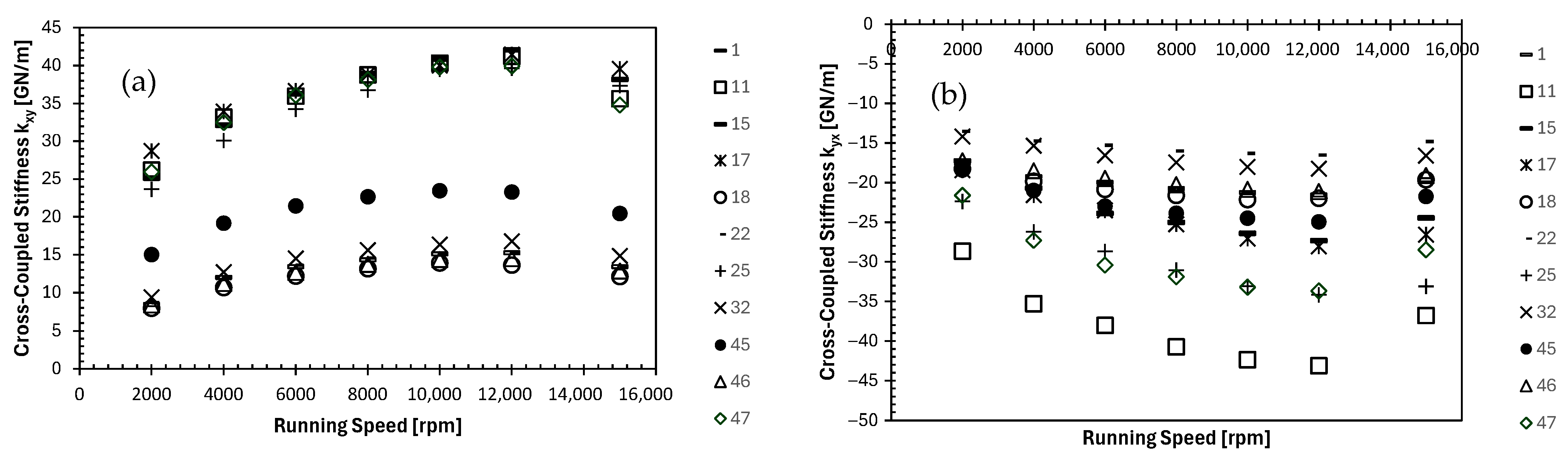 - Increased preload across pads raised stiffness and damping, improving imbalance response. However, it also increased cross-coupled stiffness, which undermines stability. The most critical conditions arose from uneven pad configurations. No single case consistently produced the highest or lowest coefficients, underscoring the nonlinear influence of pad variability.