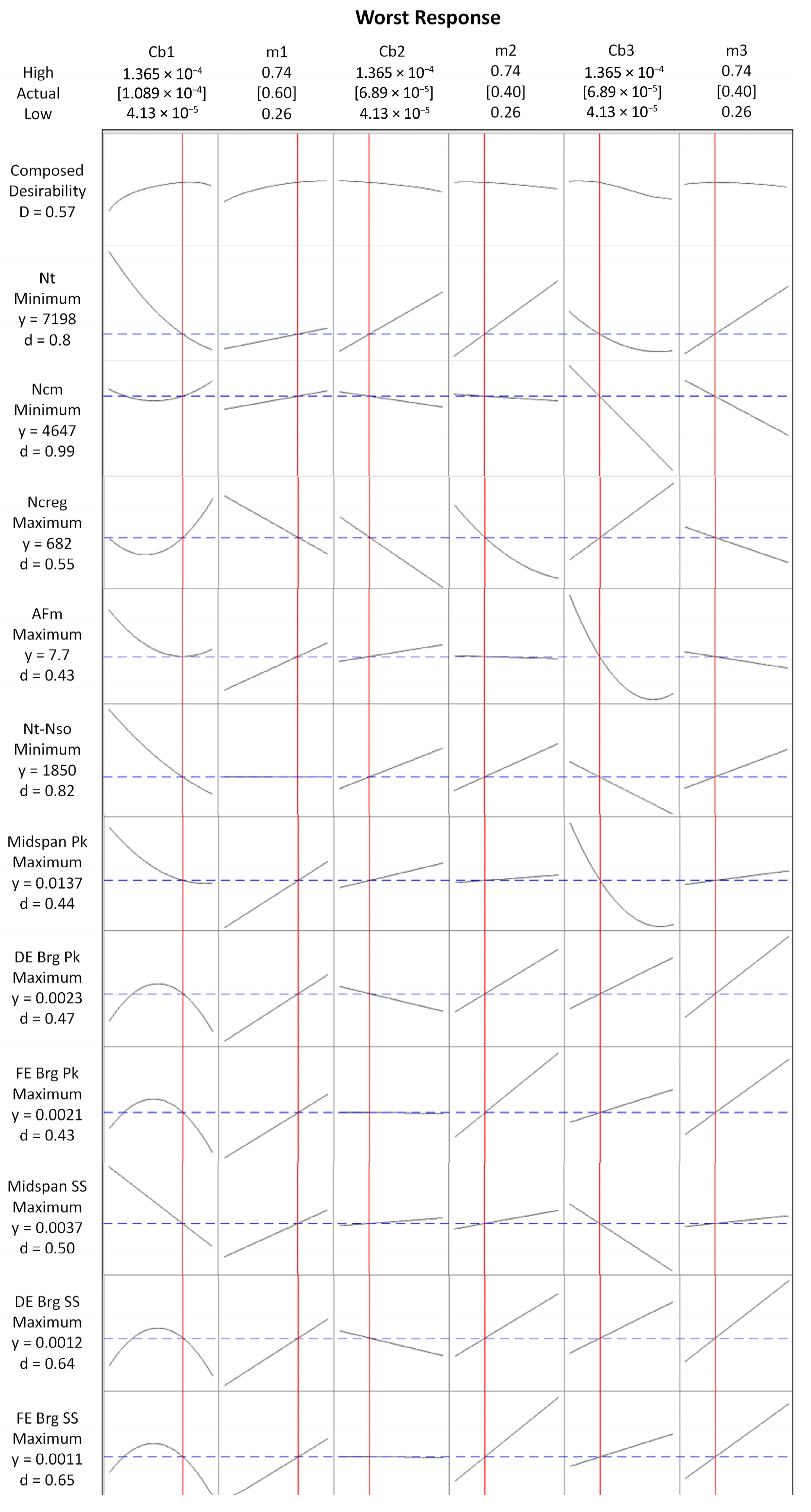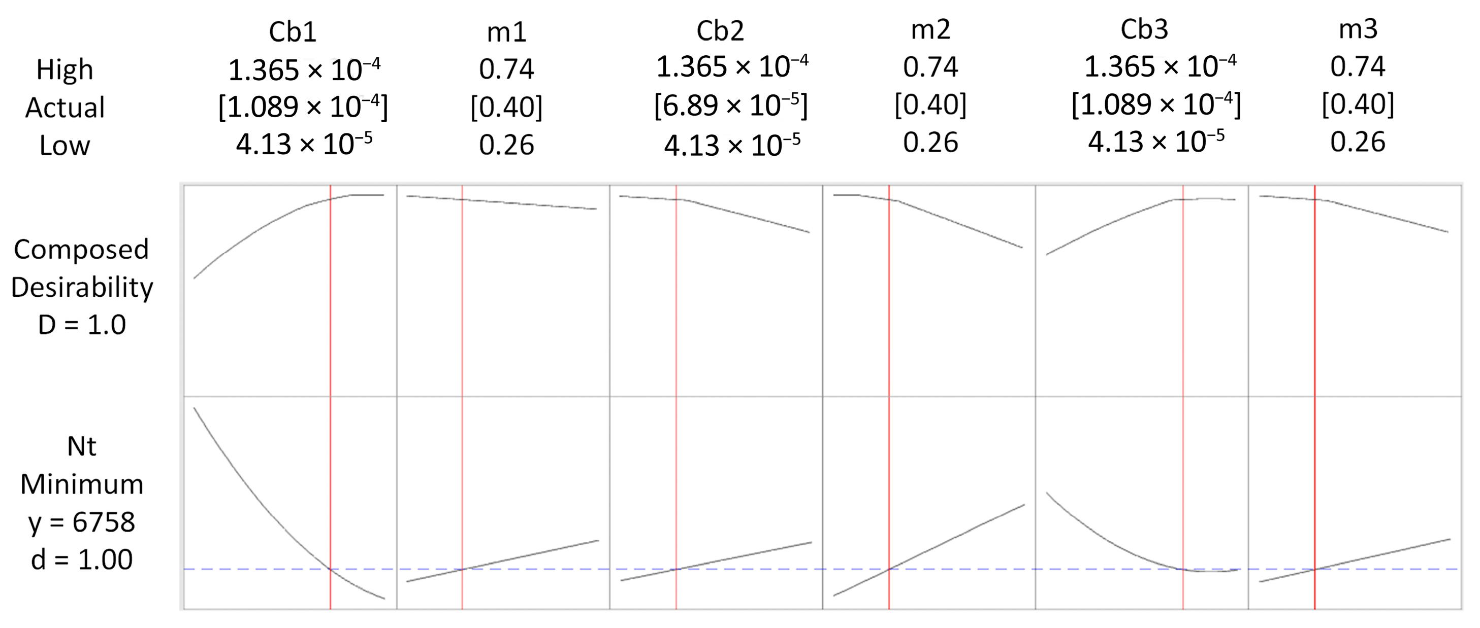 - Maximize the overall desirability D in Equation (13) with respect to the input variables: This is calculated using the geometric mean. Customarily, an acceptable overall desirability is D > 0.5. A weighting strategy of 1 for all individual di was used. In other words, all responses have the same importance in the optimization process.