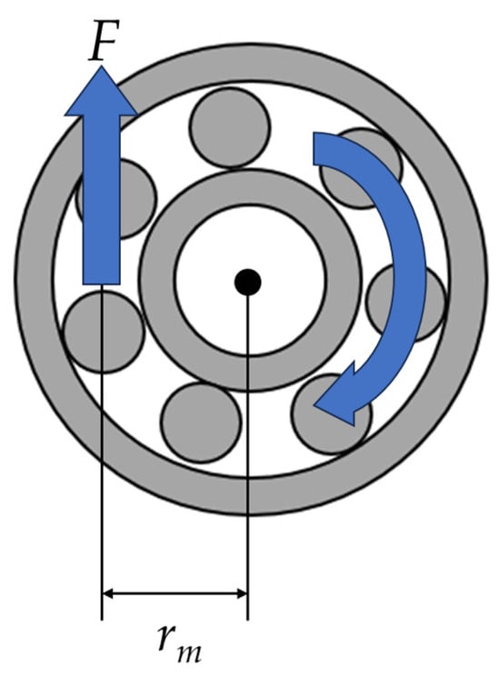 Friction torque was measured using a torque meter with a maximum measurable torque of 5 N·m (model: UTMIII-5Nm, Unipulse Corporation, Tokyo, Japan). The friction coefficient was calculated from the measured friction torque using the following relationships. A schematic diagram illustrating the generation of friction torque in the bearing is shown in Figure 2. During the experiments, the bearing rotated in the clockwise direction. The friction force acting on the bearing is denoted as F, and the mean bearing radius, defined as the midpoint between the inner and outer diameters, is denoted as rm. When the friction torque measured by the torque meter is denoted as T, the following relationship holds: