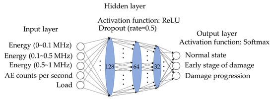 To suppress overfitting, a dropout layer was placed after each hidden layer, with a dropout rate of 0.5. The Adam optimizer was used for model optimization, and categorical cross-entropy, which is suitable for multi-class classification, was adopted as the loss function. Classification accuracy was used as the evaluation metric.
