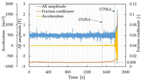 In contrast, the friction coefficient began to increase at around 1510 s and subsequently exhibited a gradual rise associated with damage progression, followed by a sharp increase in the final stage of the test (right axis in Figure 4). Notably, the onset of the friction coefficient increase was observed earlier than the pronounced increases in AE amplitude and acceleration. This result indicates that, under the present test conditions, the friction coefficient is the parameter that most sensitively and earliest reflects changes in the contact condition and wear progression at the sliding interfaces. Under dry conditions, metal-to-metal contact readily occurs between the rolling elements and raceways, and the initiation and progression of microscopic wear directly affect the friction torque, leading to the observed early increase in the friction coefficient.